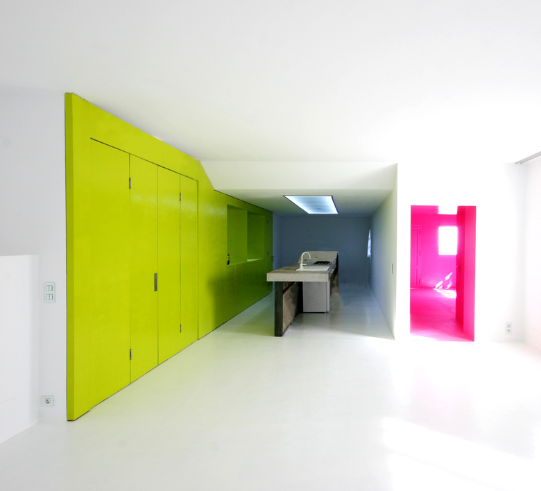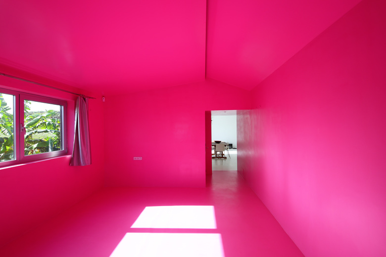 Zum Land hin ordnet sich das Rosa-Zimmer an den Wohnraum an. Es kann unterschiedentlich genutzt werden. Es ist direkt nach Aussen erschlossen. Seine starke Farbgebung erzeugt einen Filter zwischen dem Aussenraum und dem Wohnraum.