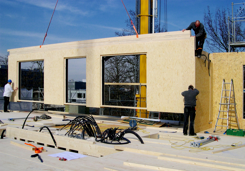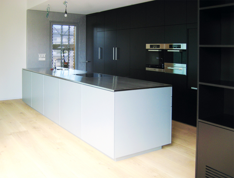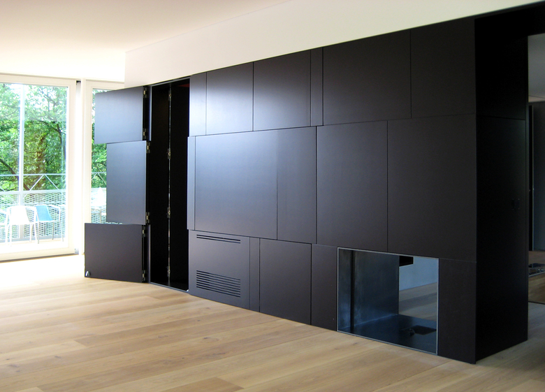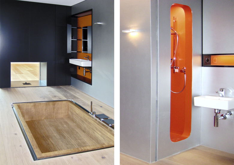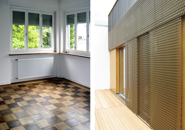 der gewachsenen Fensterordnung und steht so in einem spannungsvollen Dialog mit dem Bestand, ohne sich von ihm abzusetzen. Durch die über Eck angeordneten Erker entstehen zwei Dachterrassen mit unterschiedlichster Aussicht. Die Überhöhung der Erker und die Eckverglasungen heben das Raumgefüge vom Kernbereich ab. Die Bereiche werden zum offenen Raumkontinuum. Dieser Zone entlang angesiedelt ist eine konzentrierte Funktionswand mit Küche, Treppe, Cheminée und Schrankgefüge. Dahinter befindet sich der Privatbereich mit dem offenen Bad und dem Schlafbereich. Über die Zentraltreppe sind das Attikageschoss, die Hälfte des dritten Obergeschoss und die dritte Dachterrasse zur Maisonettewohnung zusammengefasst. Entgegen dem massiven Altbau wurde die Attikaaufstockung aus vorfabrizierten Holz-elementen gefertigt und damit kurze Bauzeiten und geringe Auflasten herbeigeführt.