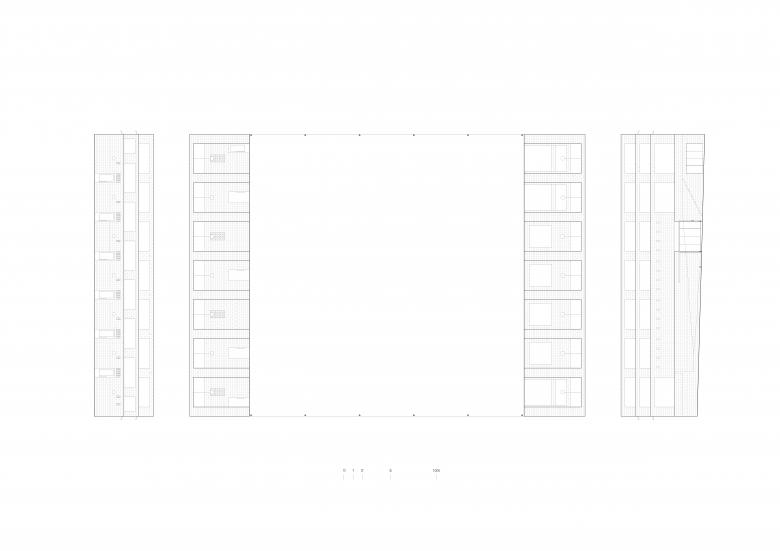 Todo es estructura. Atendiendo al reducido presupuesto (620€/m2), se invierte en aquello más trascendente: la activación de un lugar común, el volumen generoso de los espacios interiores y la entrada de luz natural. En este sentido, la construcción con muros portantes de bloque de mortero es sencilla y de fácil ejecución. Su lógica interna define la caligrafía de la obra y pauta la medida de las estancias.