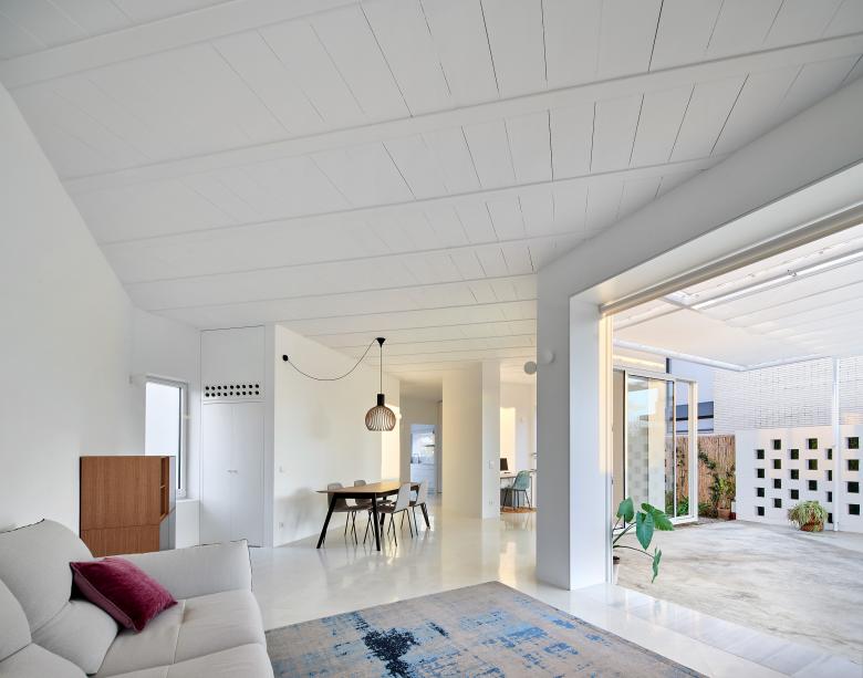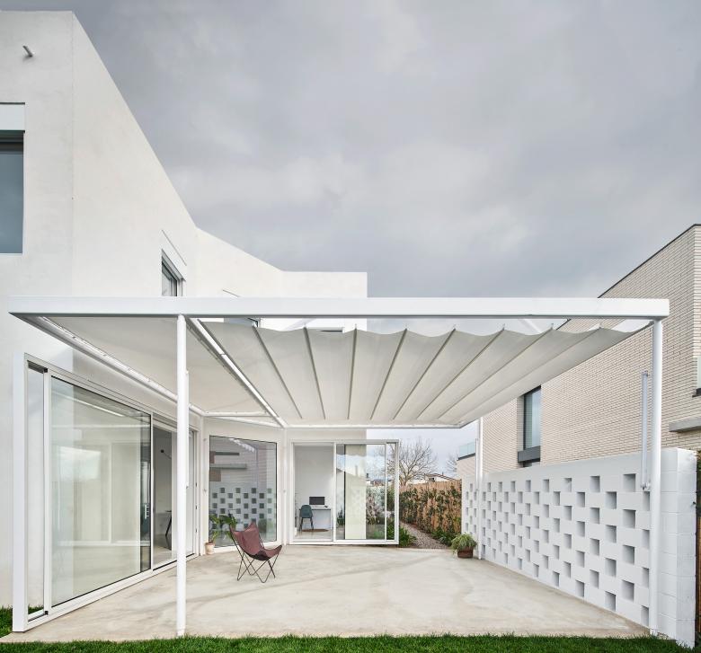 Son espacios configurados por una estructura metálica con toldos replegables, que mejoran el comportamiento climático del edificio. Ante esta arquitectura liviana, la casa es compacta, de muros de carga. Se repite un único formato de ventana perfectible, a excepción de las corredizas que maximizan la apertura de la planta baja.