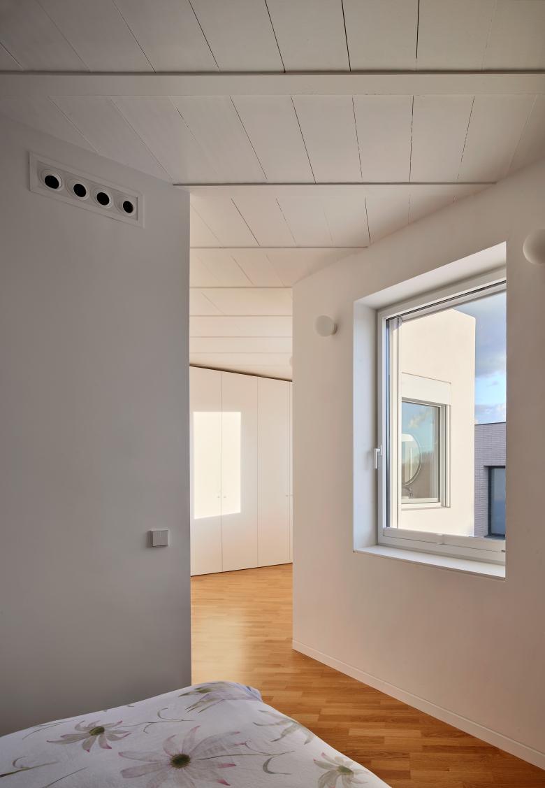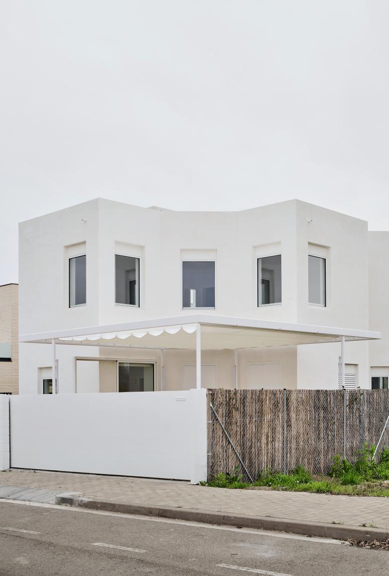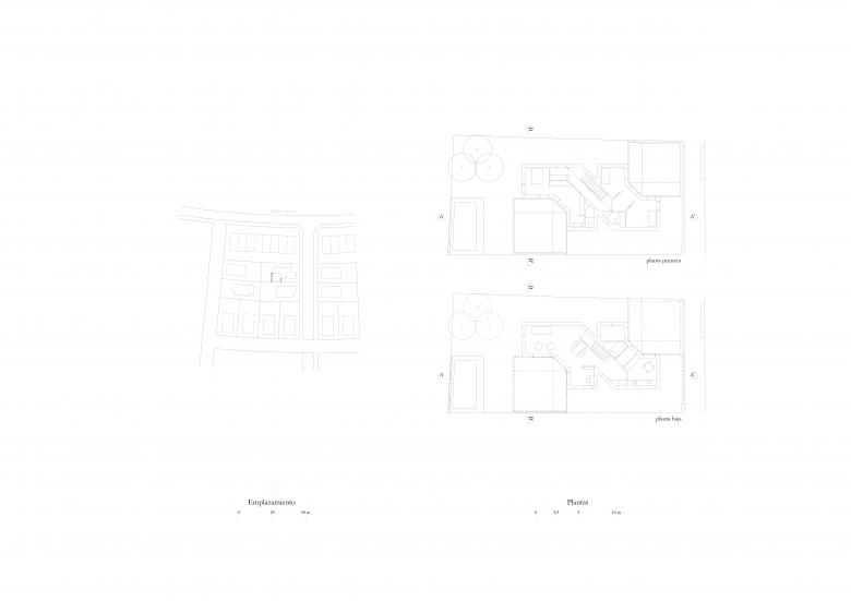 Una casa de dos plantas amoldada entre dos palios. Esta es la respuesta al conflicto habitual entre un deseo –disfrutar de los atributos espaciales una vivienda aislada- y el planeamiento –parcelas pequeñas y separación mínima a lindes de 3m-. La posibilidad de instalar elementos ligeros en el espacio no edificable es el resquicio de la ordenanza que será motor de proyecto.