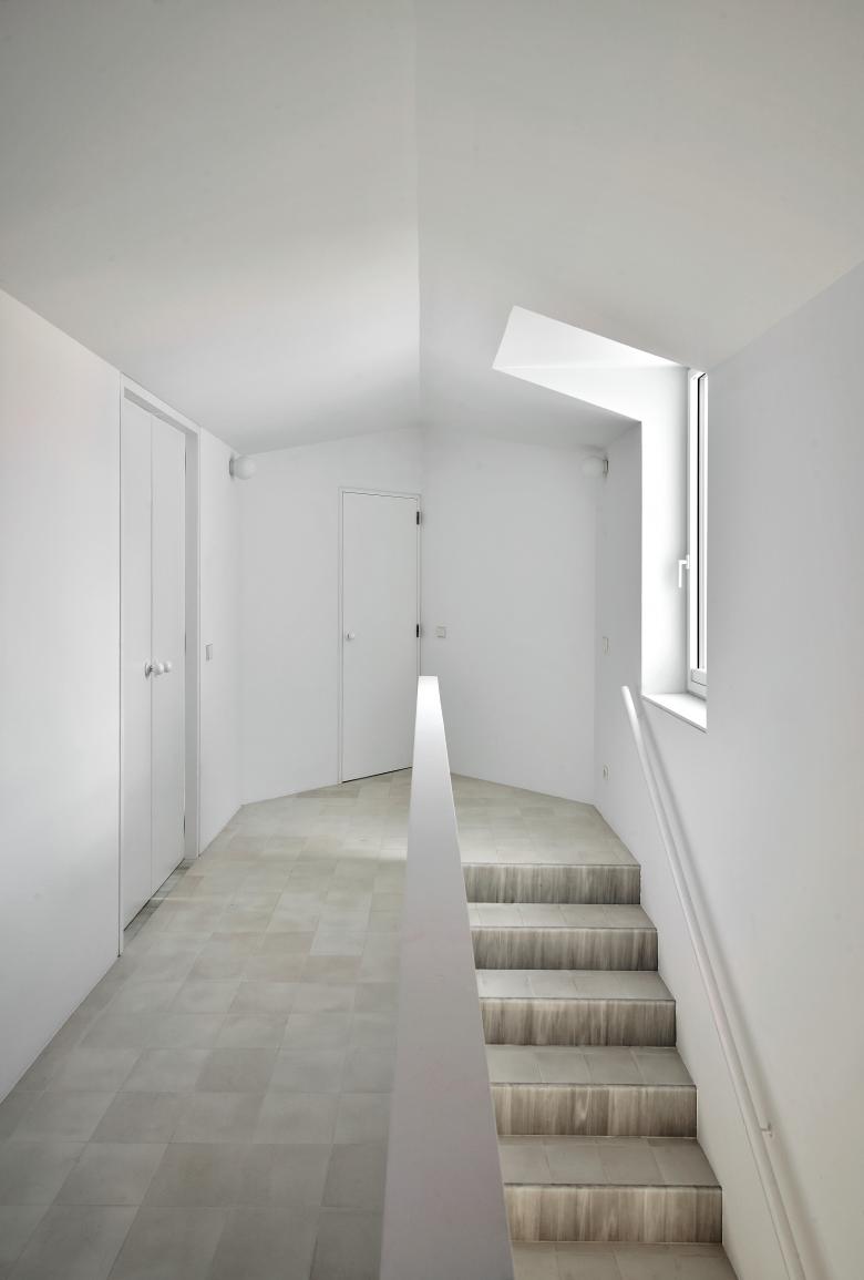 La escalera, dispuesta en diagonal en el centro, organiza la casa en dos cuerpos capicuados en C. Cada parte abraza un palio con una fachada achaflanada. La mayoría de ventanas se abren aquí, permitiendo una visión en diagonal que otorga profundidad visual y resguardo de los vecinos. La geometría y disposición de las aperturas permite disfrutar de distintos tipos de luz en una misma habitación y ver la propia casa a través de las ventanas.