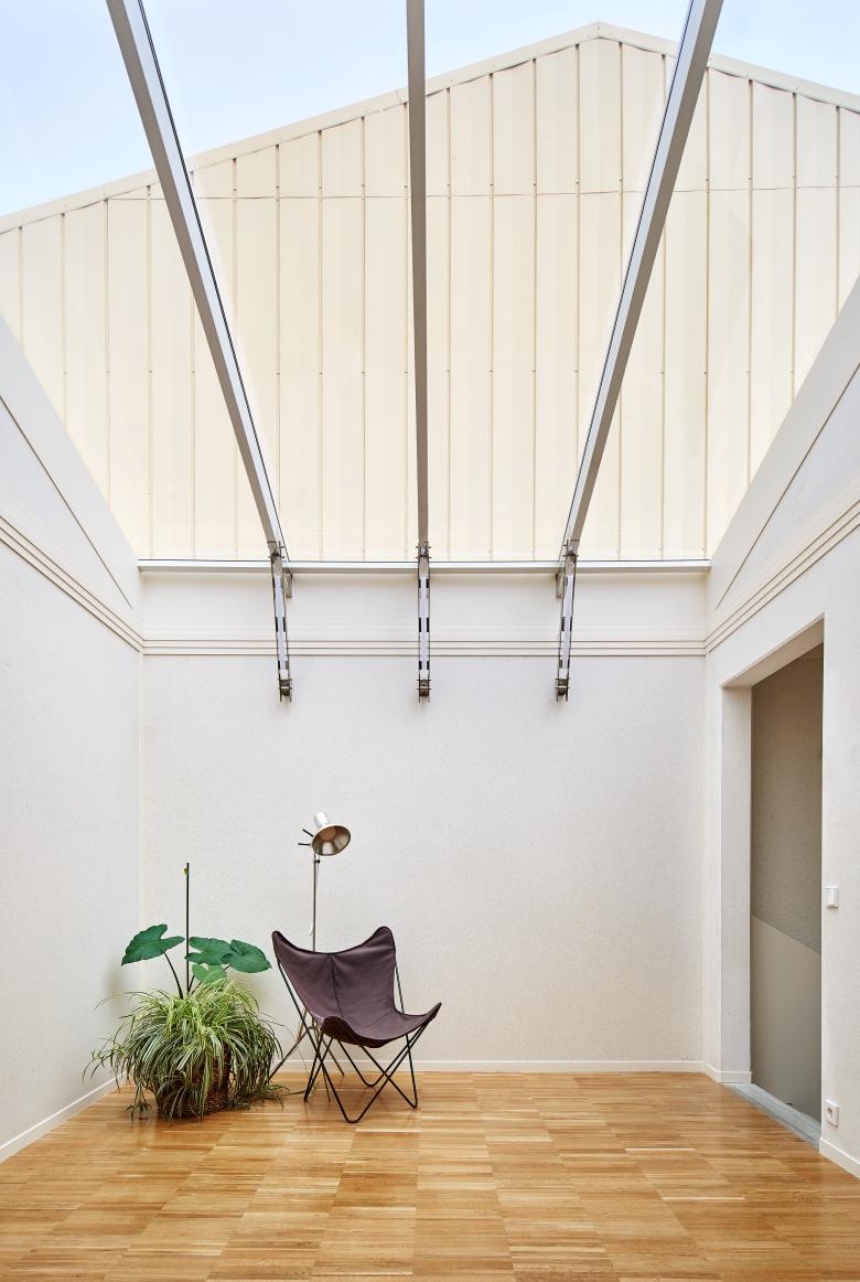 La planta puede leerse como un conjunto de cuatro filas de habitaciones iguales dislocadas. El gran espacio vacío central, entre dos vanos, es la excepción; subvierte la lógica de las piezas entre jácenas, enfatizando la presencia de los diafragmas estructurales. Esta sala interior está conectada a cuatro piezas menores que la rodean. Le aportan luz natural de distintas orientaciones, acomodan actividades complementarias y articulan las estancias restantes.