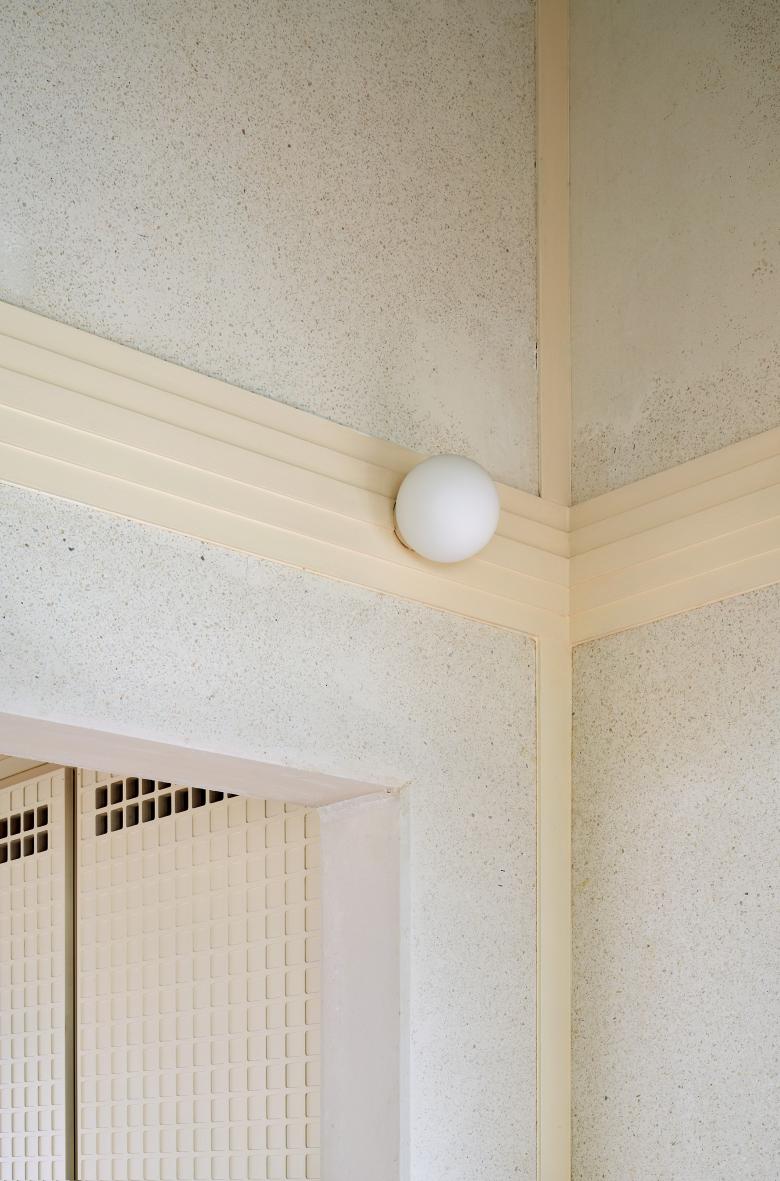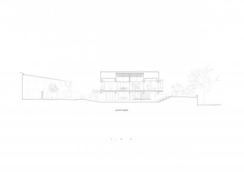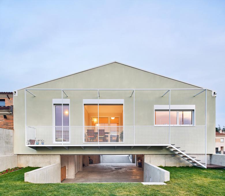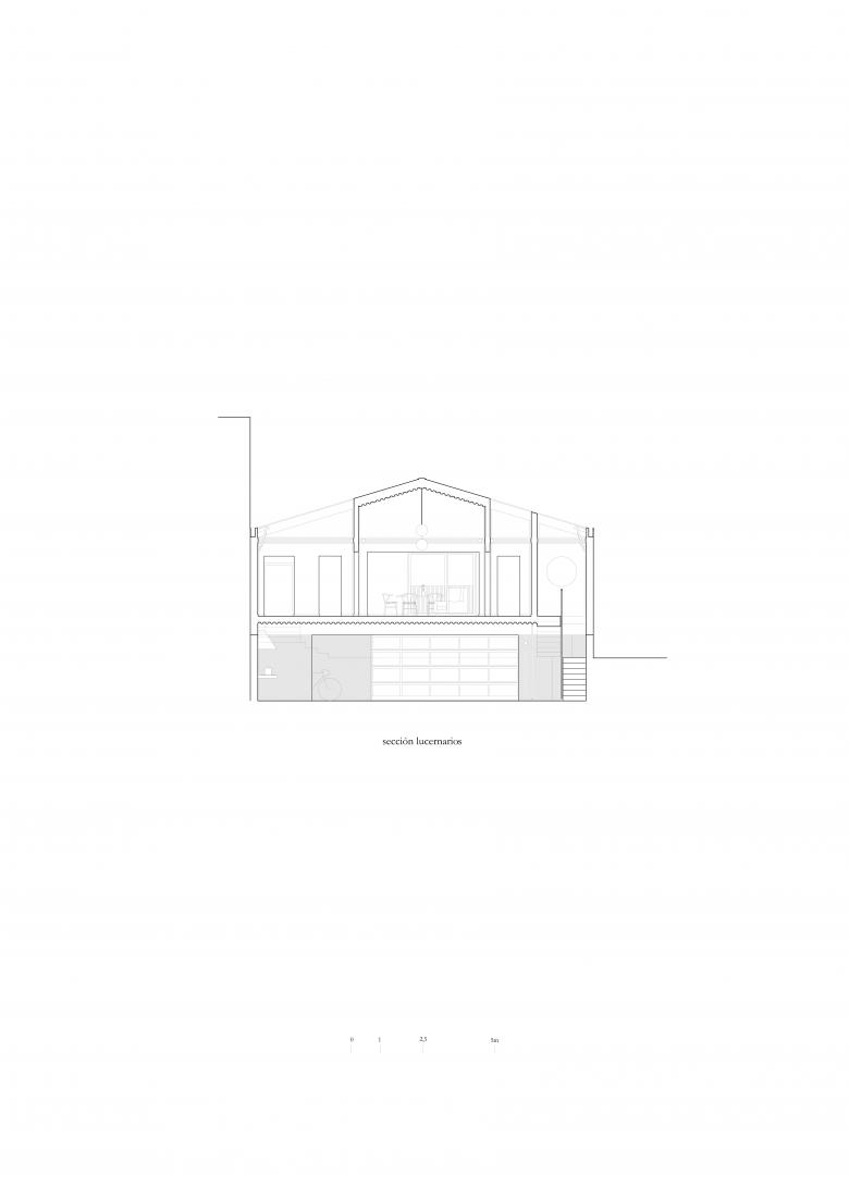 Encima se construye la casa con piezas de hormigón prefabricado, que a modo de grandes jácenas, salvan la luz del basamento. Para optimizar costes de construcción, los paneles se presentan al interior sin revestimiento, con un acabado pulido tipo terrazo. Un sistema de zócalos, esquineras y frisos de madera son la respuesta a resolver la junta correctamente, otorgando al sistema un carácter doméstico.