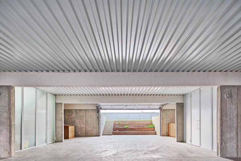 Esta pieza corona un espacio semisótano de las mismas dimensiones. Es una gran sala rectangular de uso polivalente, de carácter infraestructural y definida por muros de hormigón armado. Se abre por los extremos al exterior, enlazando con planos inclinados la calle con el jardín. Los portales acristalados la dotan de luz natural y permiten convertirla en un gran porche en verano.