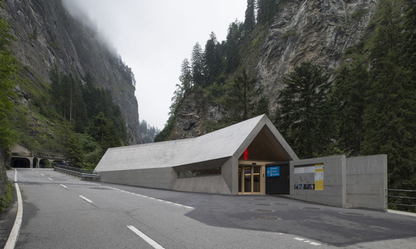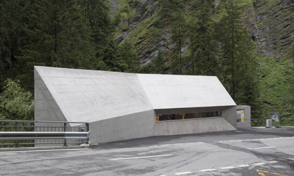 Den rund 40 m2 grossen Raum des Besucherzentrums mit Kassabereich und Verkaufsfläche überspannt ein leicht asymmetrisches Giebeldach. Während der Bau zur Strasse und zur Schlucht hin geschlossen wirkt, ist die Süd- und Nordseite des Gebäudes mit grossflächigen Fenstern versehen. Diese raumhohen, strukturellen Öffnungen rahmen die eindrückliche Landschaft. Ein schmales Trichterfenster ermöglicht die Einsicht in das Besucherzentrum von der Strasse her. Das Materialkonzept mit Beton, Holz und Stahl reagiert auf die archaische Umgebung der Schlucht.