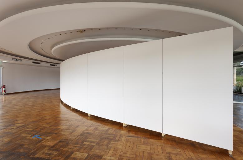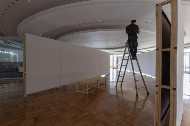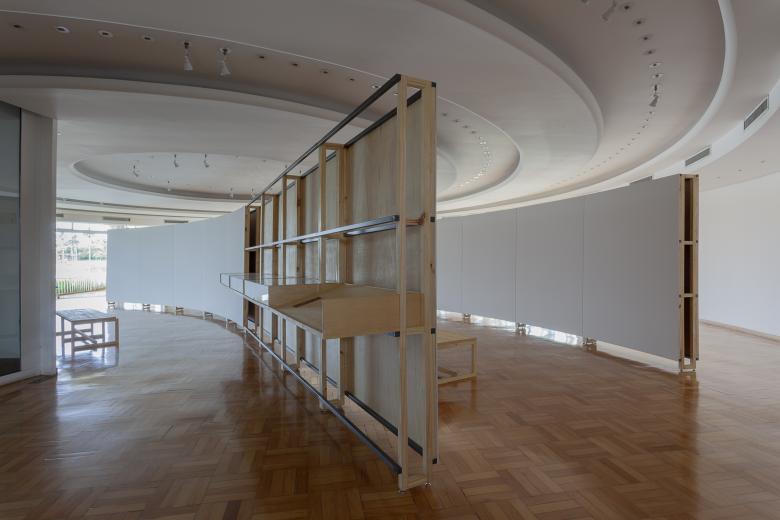 A planta do salão da Casa do Baile é circular, sendo que seu círculo é definido por uma sequência de arcos de alvenaria e vidro. Tal como a exposição que propomos, que também é feita de arcos. Em diálogo com os limites do salão, eles definem novos ambientes côncavos e convexos, ou espaços curvos dentro de um espaço curvo. São arcos que dialogam com a arquitetura e acrescentam movimentos à exposição, induzindo o visitante a percorrer os quatro lados dos painéis curvos (ou os quatro temas da curadoria) e criando distintas passagens de espaço – por hora estreitas, por hora abertas e largas.