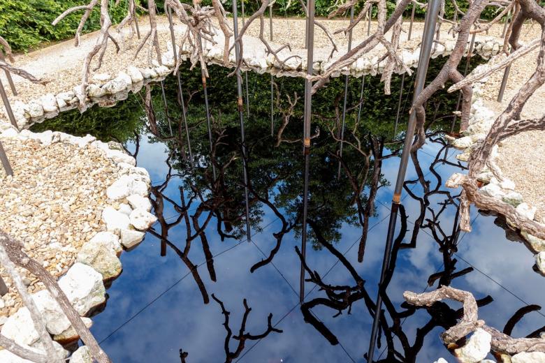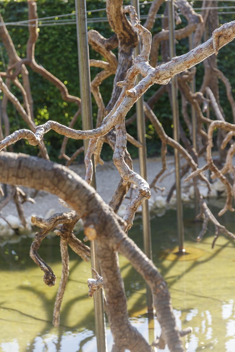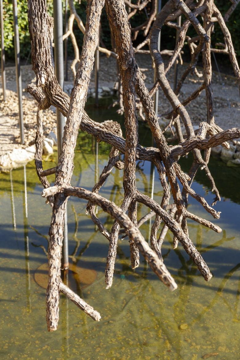 Além da referência aos abatedouros, outra conotação do jardim é que o Cerrado é um bioma de árvores com raízes muito maiores que os galhos. São plantas adaptadas a regiões mais secas, capazes de alcançar lençóis freáticos muito baixos e, por isso, plantas mais terrestres que aéreas. Órgãos sem olhos e sem ouvidos que exploram um mundo subterrâneo sem sol e sem movimento, as raízes fazem das árvores seres anfíbios, ligando a terra ao ar, vivendo num mundo críptico e nutrindo as folhas que buscam a luz (Emanuele Coccia, 2016). É justamente nas profundezas do solo ácido e imprestável do Cerrado que elas encontram vida onde nenhum outro organismo consegue, transformando tudo o que tocam em energia e alimento.