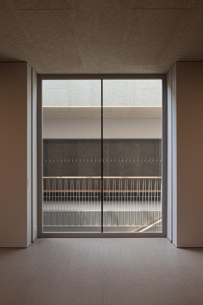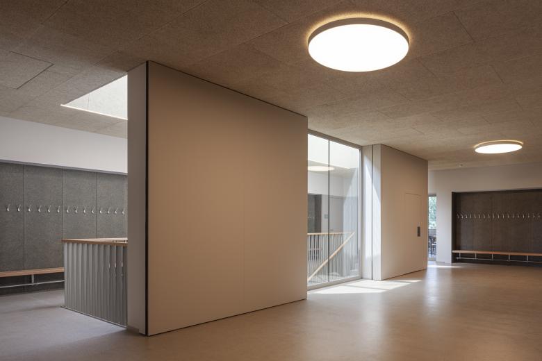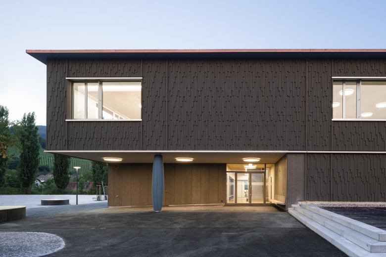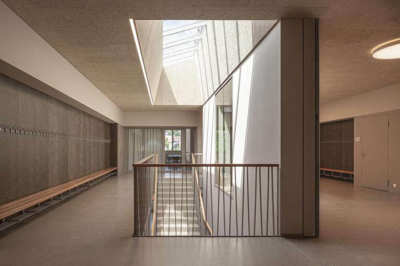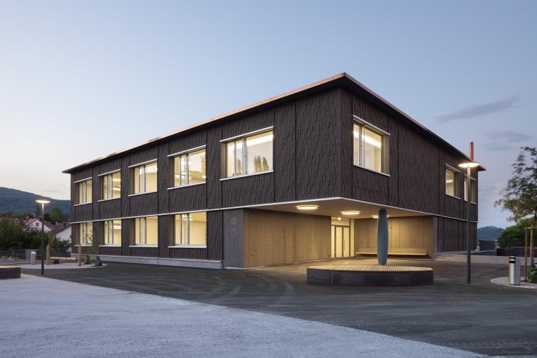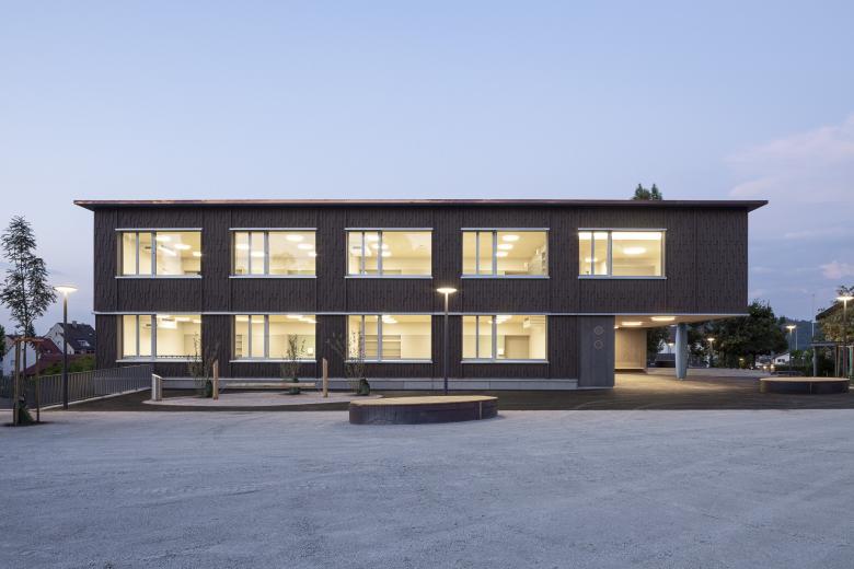 Der Neubau positioniert sich als kompakter und regelmässiger Baukörper mit rechteckiger Grundfläche im Bereich der beiden zu ersetzenden Bestandsbauten. Das neue Schulhaus ist Drehscheibe im Gebäudeensemble der Schulanlage westlich der Schulstrasse.