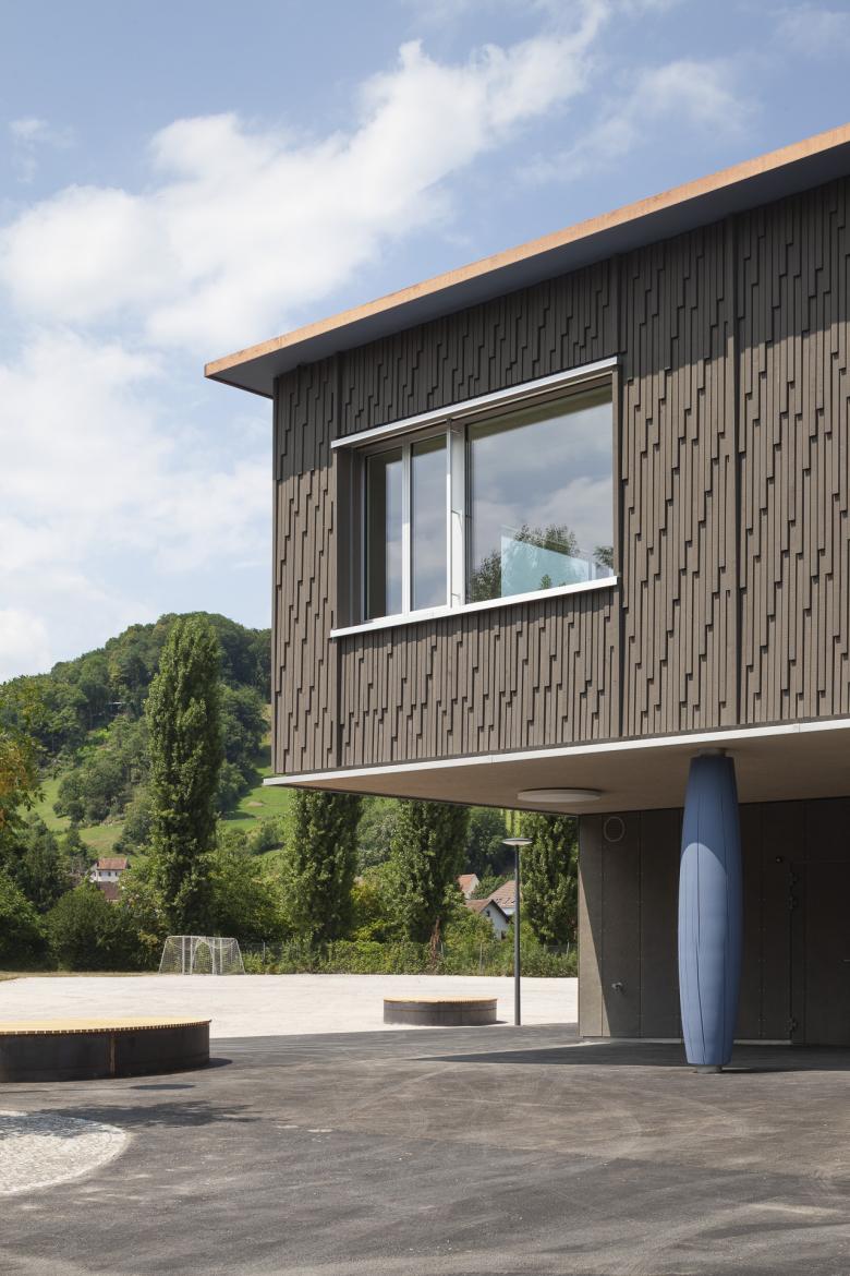 Das dreigeschossige Gebäude gliedert sich in ein Sockelgeschoss, welches mit Betonelementen verkleidet ist. Darauf sitzt ein zweigeschossiger Holzbau mit einer hinterlüfteten Holzfassade. Der Fassadenaufbau widerspiegelt die Konstruktion des Gebäudes. Das Untergeschoss wird inklusive der Geschossdecke in Massivbauweise erstellt. Ab dem Erdgeschoss ist das Gebäude mit vorfabrizierten Holzelementen konstruiert.