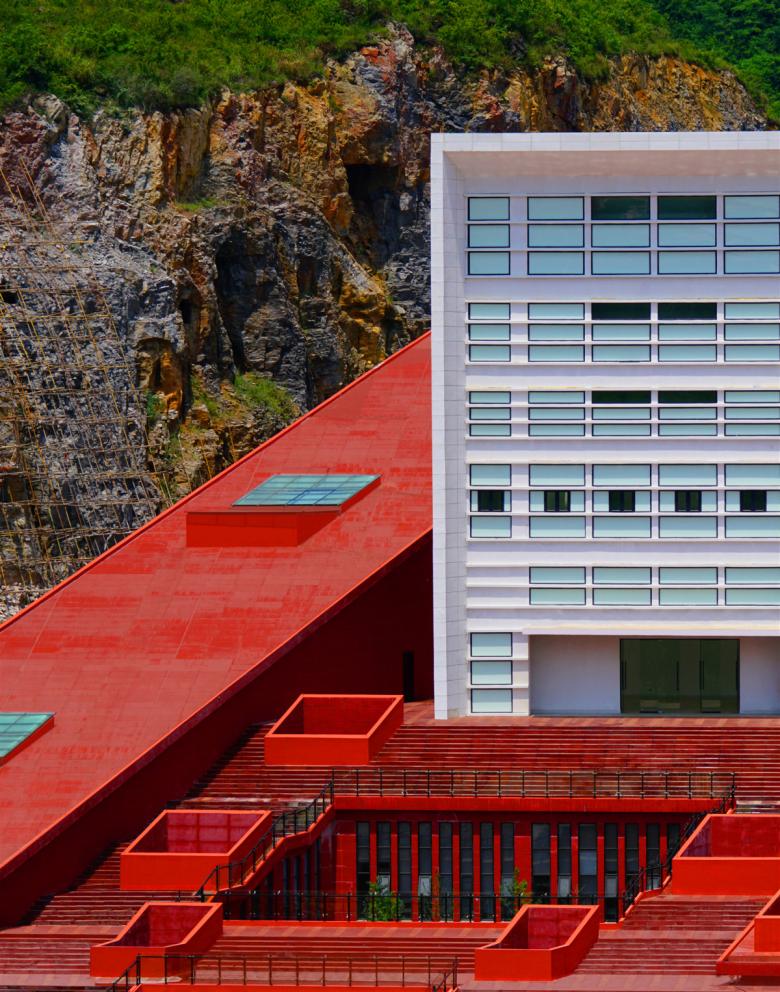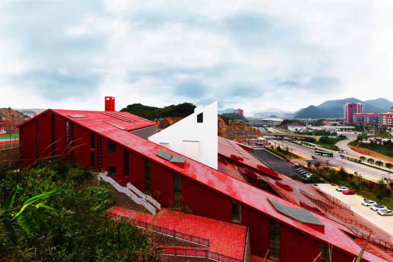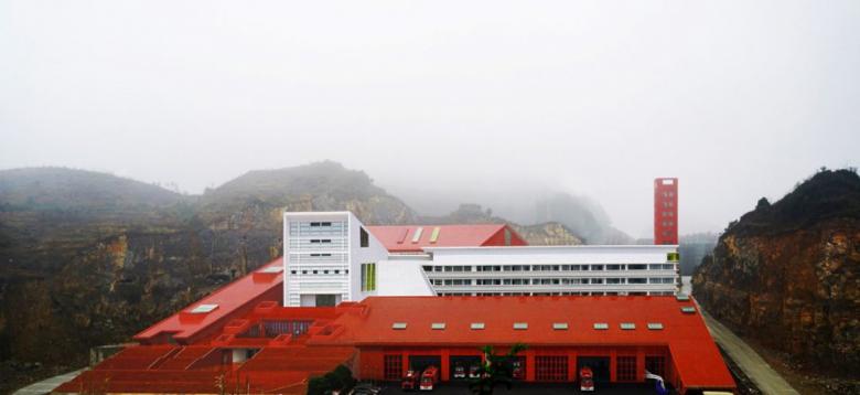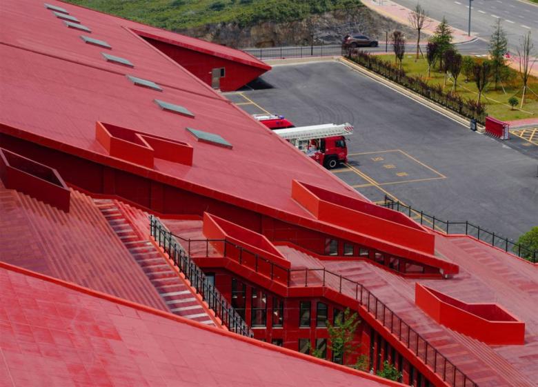 The fire station is located at the very center of Guizhou Province, near its main city, Guiyang. The building grows in between two steep trapezoid-shaped picks, 30m high, facing Huayan Road, an important road artery.