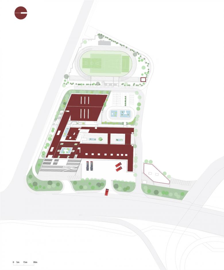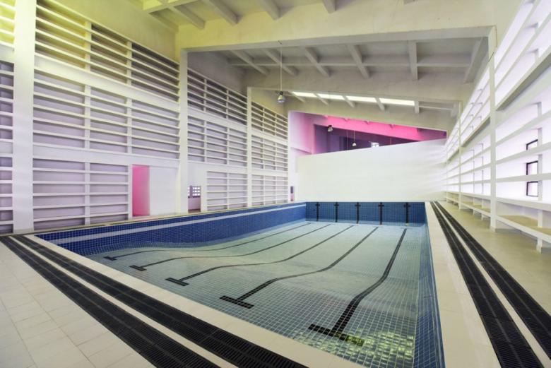 As in the most typical style of West-line, a severe strong architecture always meets open courtyards, some more wide and open, where to exercise and practice group sports, others more quiet, with water features, to create different environments. The light also plays an important role giving different personalities to different spaces. While on the swimming pool or indoor sports playground we have a diffuse light, in the Honor Hall the light is 'measured' to highlight only few architectural elements and to create iconic shadows. Architects paid particular attention to the design of the staircase. Far from being only passages or connection between different floors, these cores have long cantilevered areas and their own lighting system.