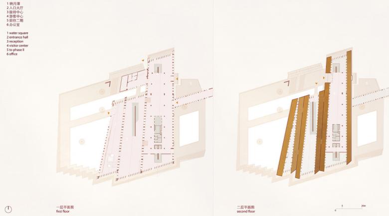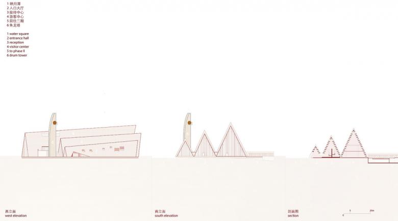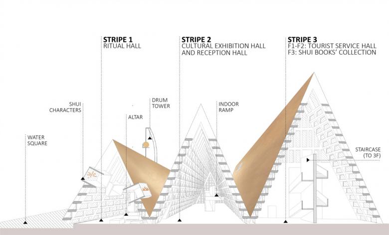 The building itself consist of three main stripes, which combine all the functions of the tourist-cultural center. The first is the ritual hall, which with its sharp edges, strong colors and narrow space aims to create a strong first impression on visitors. The second stripe still keeps the sharp roof but welcomes visitors with less dramatic tones and serves cultural exhibition and reception hall. In the third stripe, which has three floors, at the ground level we lose the pitch roof to find a more conventional space that includes all the main functions: visitor and service center, cafeteria, toilets, business center and an upstairs office area. On the third floor is displayed a small collection of Shui’s books.