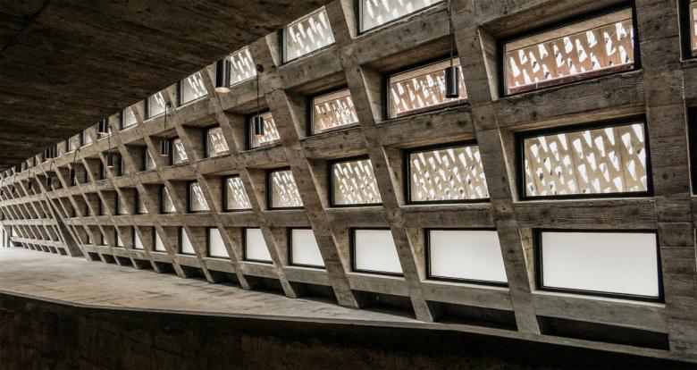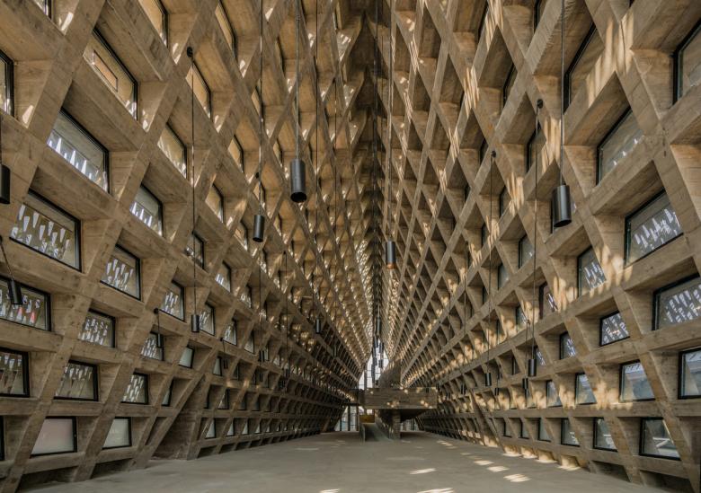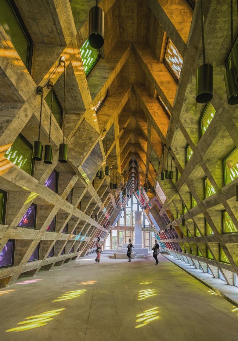 The concrete is marked strongly by a wooden pattern, given by the pine quarterdecks. Pine wood is one of the most common materials in the Sandu area and the contemporary concrete structure echoes the local traditional wooden architecture. Due to the lack of resources and local expertise in concrete architecture, the architects established a whole concrete production process-based matrix, reducing the difficulty in construction for large areas of fair-faced concrete.