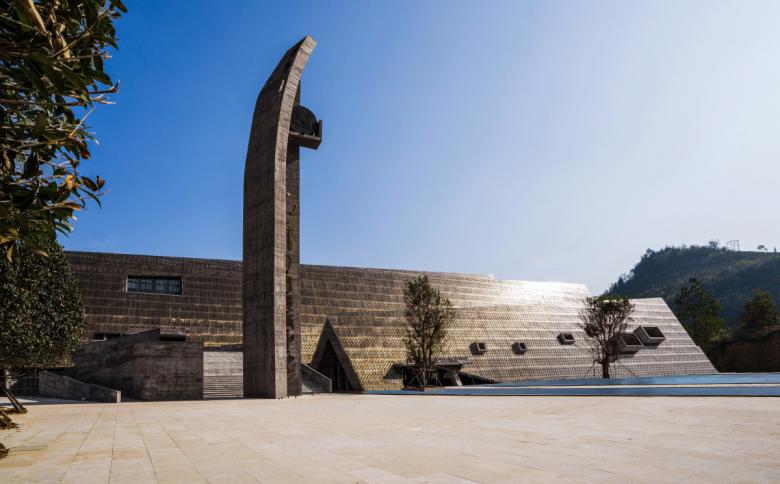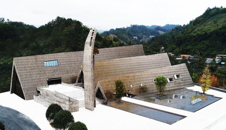 Located in Qiannan Autonomous Prefecture, Guizhou Province, Shui Cultural Center is the land of the Shui. The Shui Nationality is one of the ancient ethnic minority groups in China. Despite being small in number, the Shui people still retain their own language, together with their unique system of pictographs. The whole project reminds of their traditions as well as long history and architects’ aim is to translate Shui’s ancient rituals into the design, through the use of overlapping roofs, bronze, altars and in recreating a holy atmosphere.