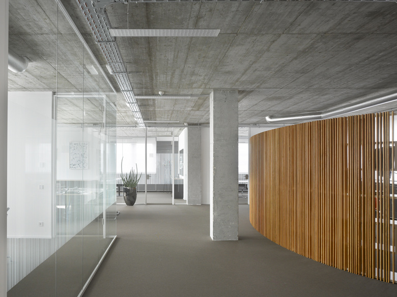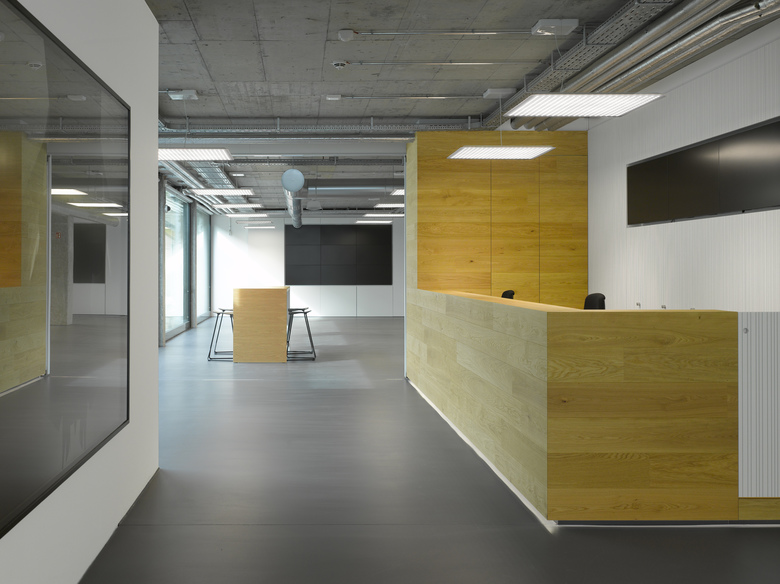In den oberen Geschossen des Altbaus wurden die Büros in einfacher Weise neu strukturiert: Transparenz und freundliche, helle Materialien verleihen den alten Büros ein neues, atmosphärisches Aussehen. Eine Besonderheit bildet das erste Obergeschoss, das für das junge Firmensegment CODE N mit einfachen, von einem Künstler entwickelten Papptrennwänden gestaltet wurde.