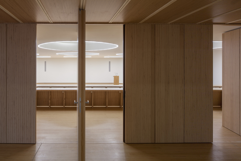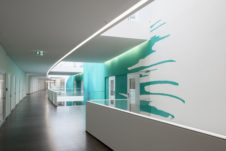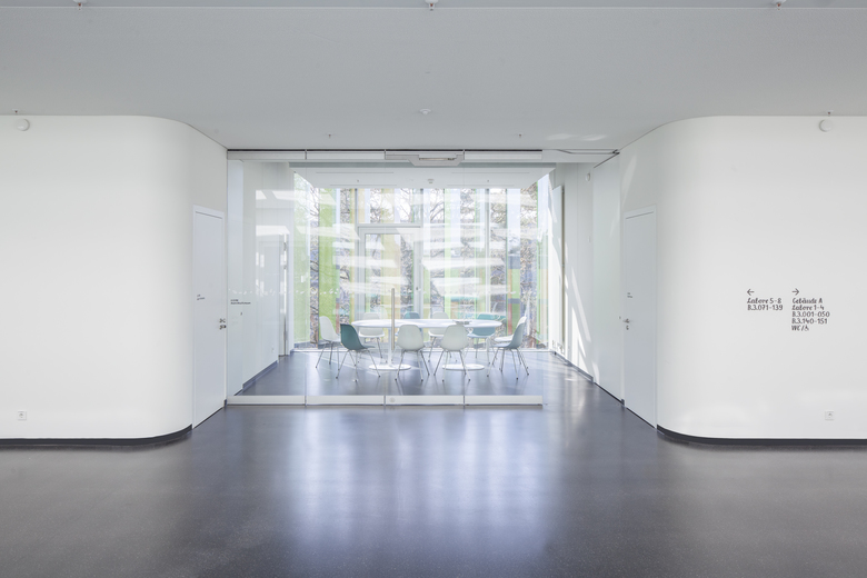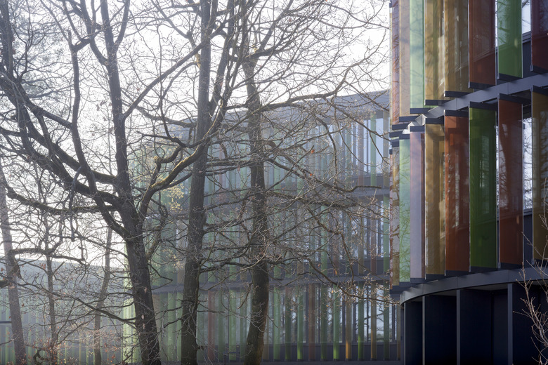 Prägendes Element des Ortes ist ein Kiefernwald. Trotz des großen Bauvolumens gehen die Gebäude darin auf – eine Folge der Ausformung der Baukörper und ihrer Fassadengestaltung. Obwohl die Arbeitsplätze bis zu 23 Meter von der Fassade entfernt liegen, ist die besondere Lage im Wald überall spürbar. Dazu trägt auch die prägnante Fassade aus Glaslamellen bei, die den Wald thematisiert, ihn hinein- und zurückspiegelt und mit den changierenden Farbtönen seine Laubfärbung aufnimmt, die sich mit den Jahreszeiten ändert.