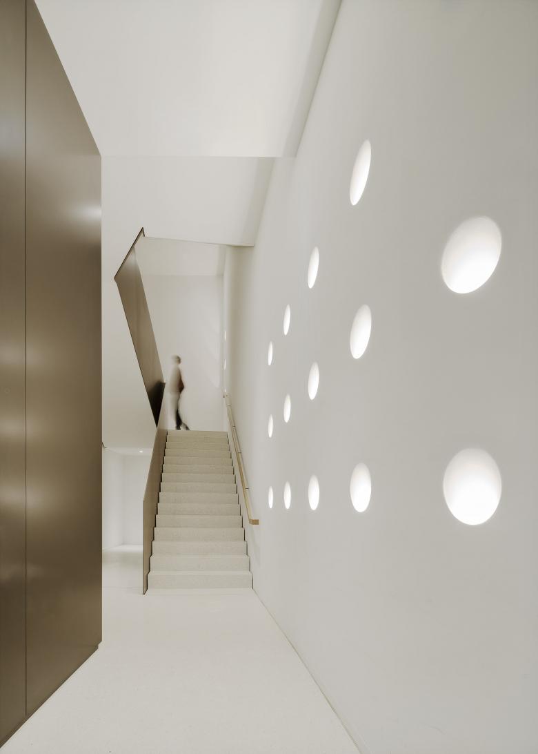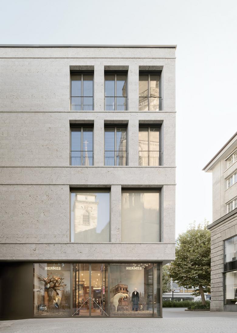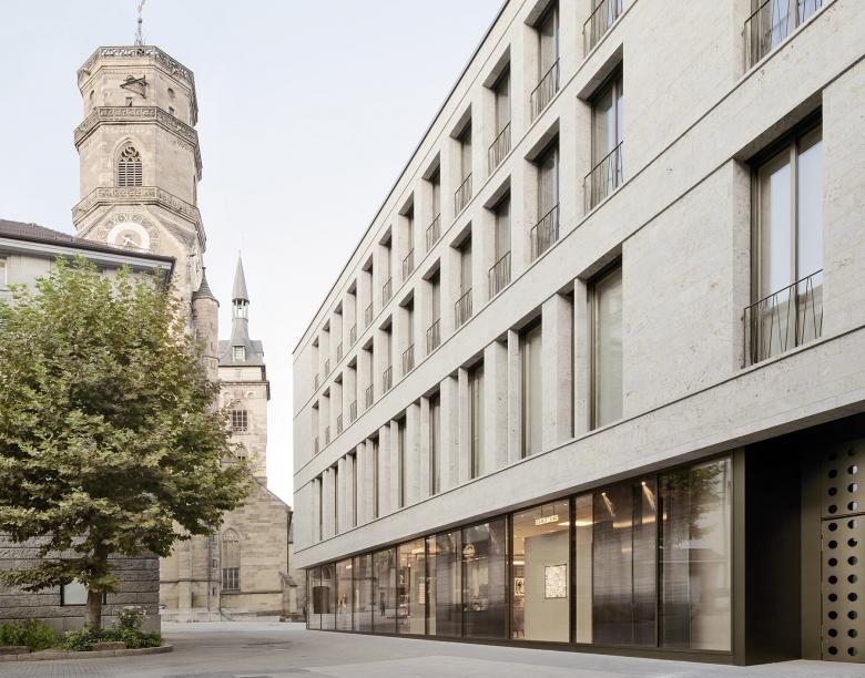 Mit der Fassade aus Mooser Muschelkalk wurde ein typisches Material aus der Region übernommen. Ein grober Kratzschliff verleiht dem Stein einen helleren Farbton, so ist er deutlich als Naturstein zu identifizieren. Die Fassade des Neubaus ist plastisch ausgebildet und fein strukturiert, um die charakteristische Architektursprache der Fünfzigerjahre aufzunehmen. Das von Karl Gonser 1956 fertiggestellte Gebäude »König von England«, das sich in räumlicher Nähe befindet, ist ebenfalls eine wichtige Referenz. Zugleich zeigt sich der Neubau als klar gestalteter Kubus, der deutlich in der zeitgenössischen Architektur verortet ist.