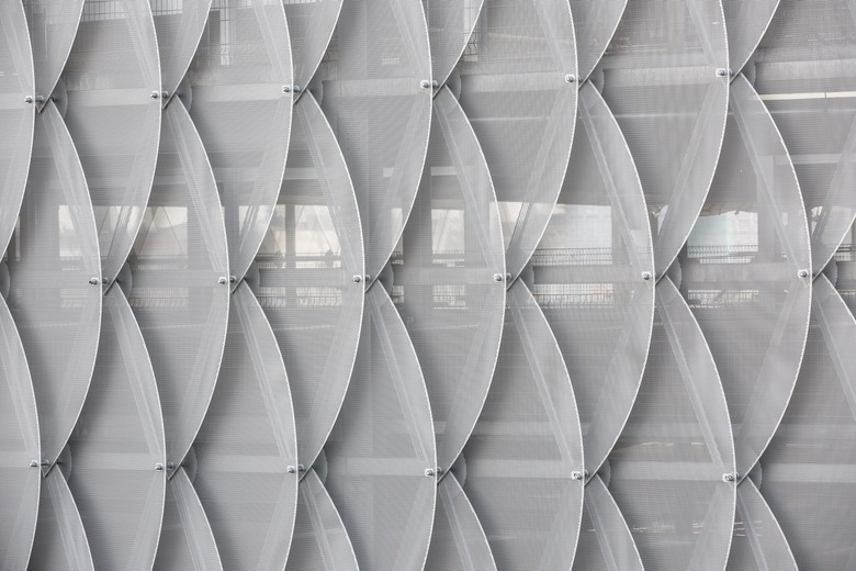 Für die Übersetzung dieses Ansatzes wurden rund 3.000 lasergeschnittene Paneele mit Randverstärkung aus Lochblech gefertigt. Die kiemenartigen Öffnungen sowie der Lochanteil der Bleche selbst gewährleisten dabei die notwendige, natürliche Durchströmung des Parkhauses mit Luft und zugleich die natürliche Belichtung des Inneren. Durch die Überlappung der Bleche entstehen interessante geometrische Muster, die insbesondere bei Nacht eine sinnliche, zeichenhafte Symbolik entwickeln.