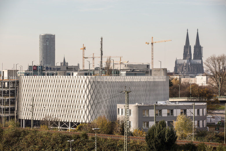 Das Parkhaus P22a der Koelnmesse (Entwurf: schultearchitekten, Köln) befindet sich an der Zoobrücke und bietet 3.260 Stellplätze auf 5 Parkebenen. Unsere Aufgabe bestand darin, auf dem S-förmig geschwungenen Grundriss eine innovative und zeichenhafte Fassade für die Messe und die Stadt Köln zu entwerfen.