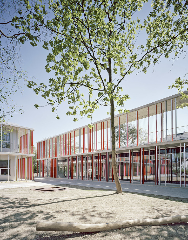 Hervorgegangen aus einem Wettbewerb (Mehrfachbeauftragung), wurde die zweigeschossige Grundschule nach dem Prinzip der Montessori-Pädagogik entwickelt. Charakteristisch hierfür ist das sogenannte Lernhaus, das in Form von großzügigen, offenen Nutzungsbereichen vor den Klassenräumen umgesetzt wurde.