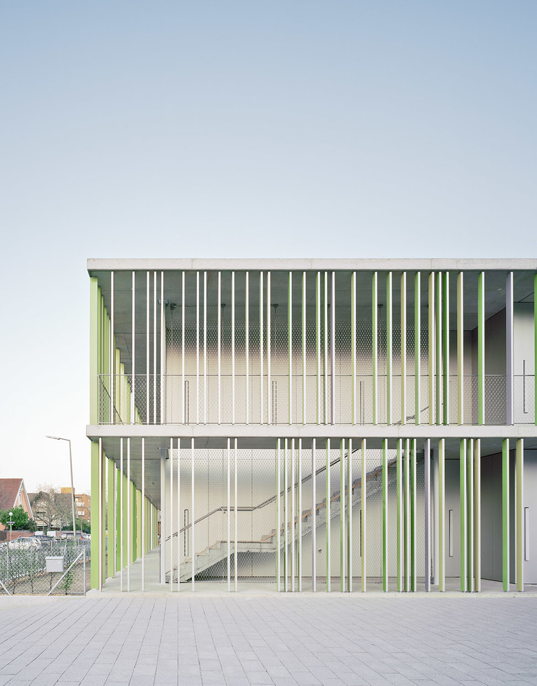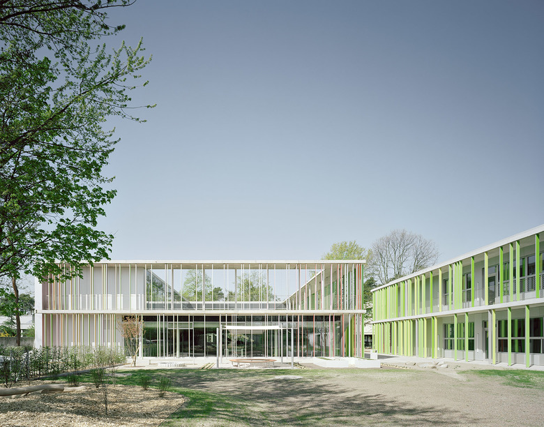 Beide Neubauten sind als klare rechtwinklige Körper gestaltet, die ihre besondere Prägung durch die geschosshohen, farbigen Aluminiumprofile erhalten. Diese in freiem Rhythmus gesetzten Lamellen bewirken, dass die Fassaden - je nach Blickrichtung - in einem stets wechselnden Farbspiel aus Rot- oder Grüntönen erscheinen.