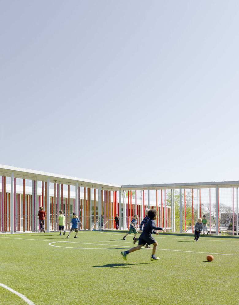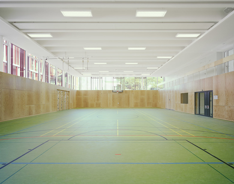 Die benachbarte Sporthalle ist ca. 3 Meter tief in das bestehende Terrain eingegraben. Ihre Dachfläche kann als Pausenbereich und zusätzliches Spielfeld genutzt werden. Durch einen überdachten, winkelförmigen Umgang erhält diese Ebene eine klare räumliche Fassung.