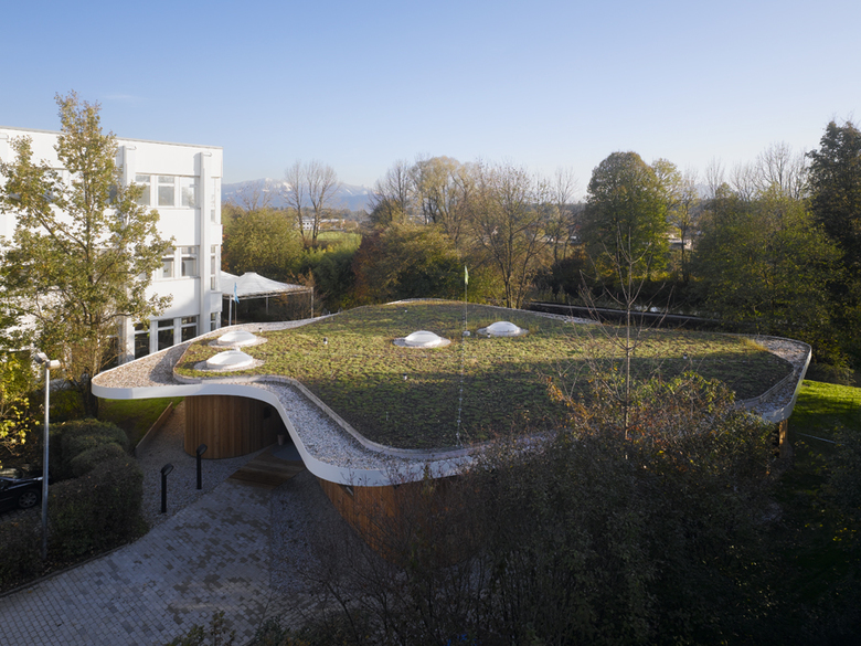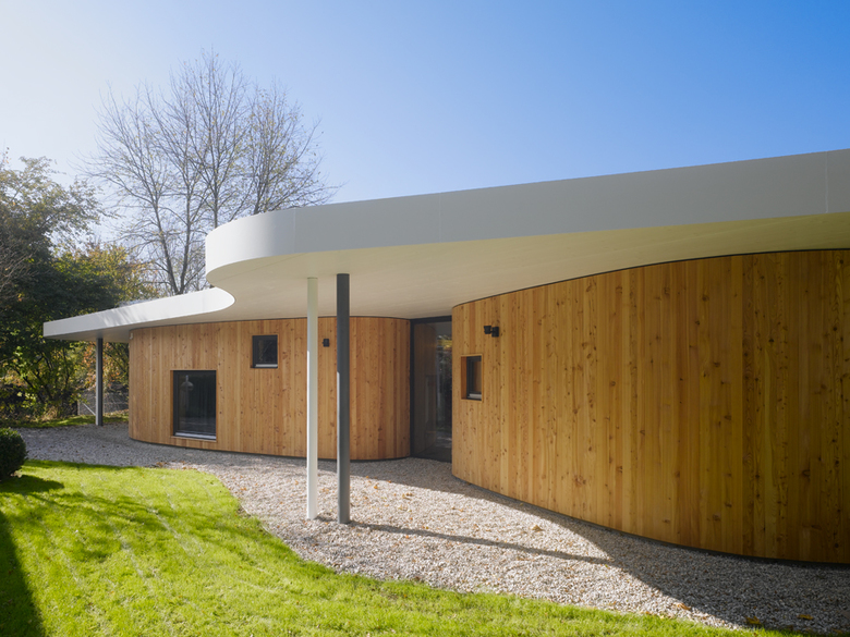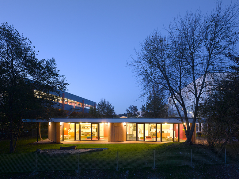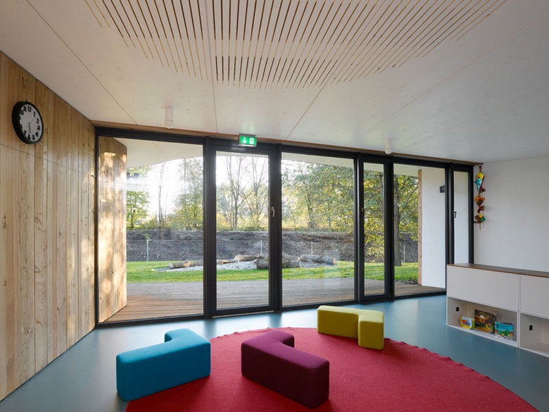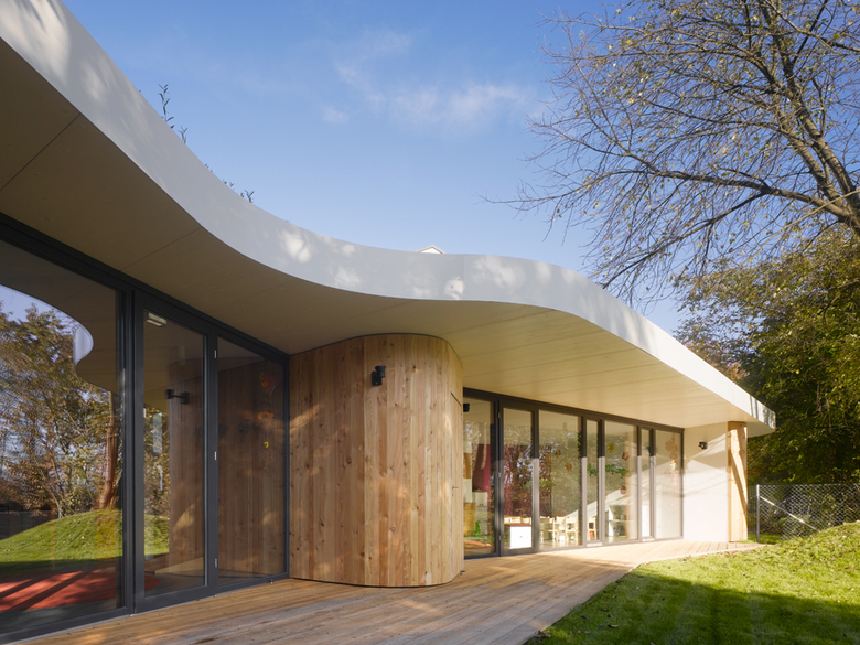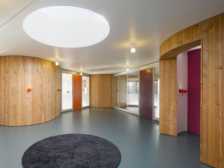 Fließende Formen dominieren die Kindertagesstätte. Durch die versetzt angeordneten, gekrümmten Schalen werden unterschiedliche Innenräume, wie Gruppen- und Ruheraum gebildet. Dazwischen gibt es Platz für Spielkreise, einen Mehrzweckraum und eine Bobbycar-Zone. Die Raumvolumina sind spielerisch frei unter der amorph konturierten Dachplatte angeordnet. Für den Bau wurden ausschließlich heimische Materialien verwendet, die Dämmung besteht aus recyceltem Papier.
