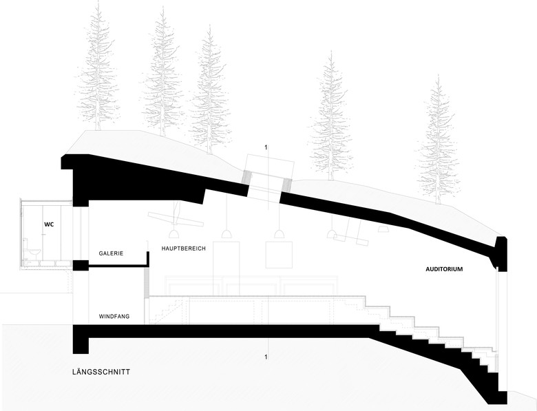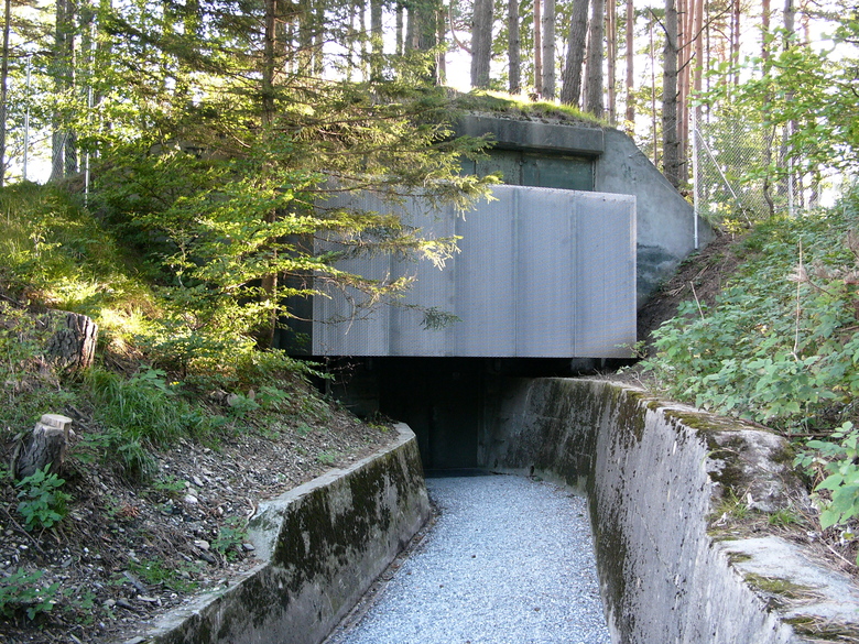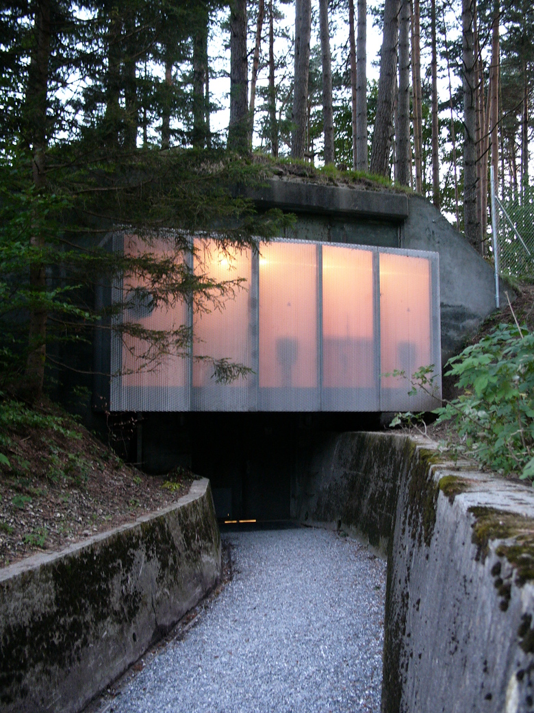 Solche Bunker sind massiv gebaut und im Innern meistens sehr feucht, weshalb passende Nutzungs- und Umbaukonzepte nicht ganz einfach zu finden sind. Dock Dank filigranen Eingriffen, einem kleinen Anbau sowie neuen Strom- und Wasseranschlüssen hat die alte Militärseilbahn nun eine Zukunft als Forstauditorium mit moderner Vortragstechnik und spektakulärer Aussicht gefunden. Das Charakteristische der ausrangierten Militärinfrastruktur blieb erhalten: Als neues Element wurde einzig „ein getarnter Rucksack“ angehängt. Der Containerartige Zusatz ist in Metallgitter eingepackt und schafft Platz für die sanitären Anlagen und die Technik. Zudem wurde das Oberlicht reaktiviert, um den unterirdischen Schulungs- und Veranstaltungsraum zusätzlich natürlich zu belichten.