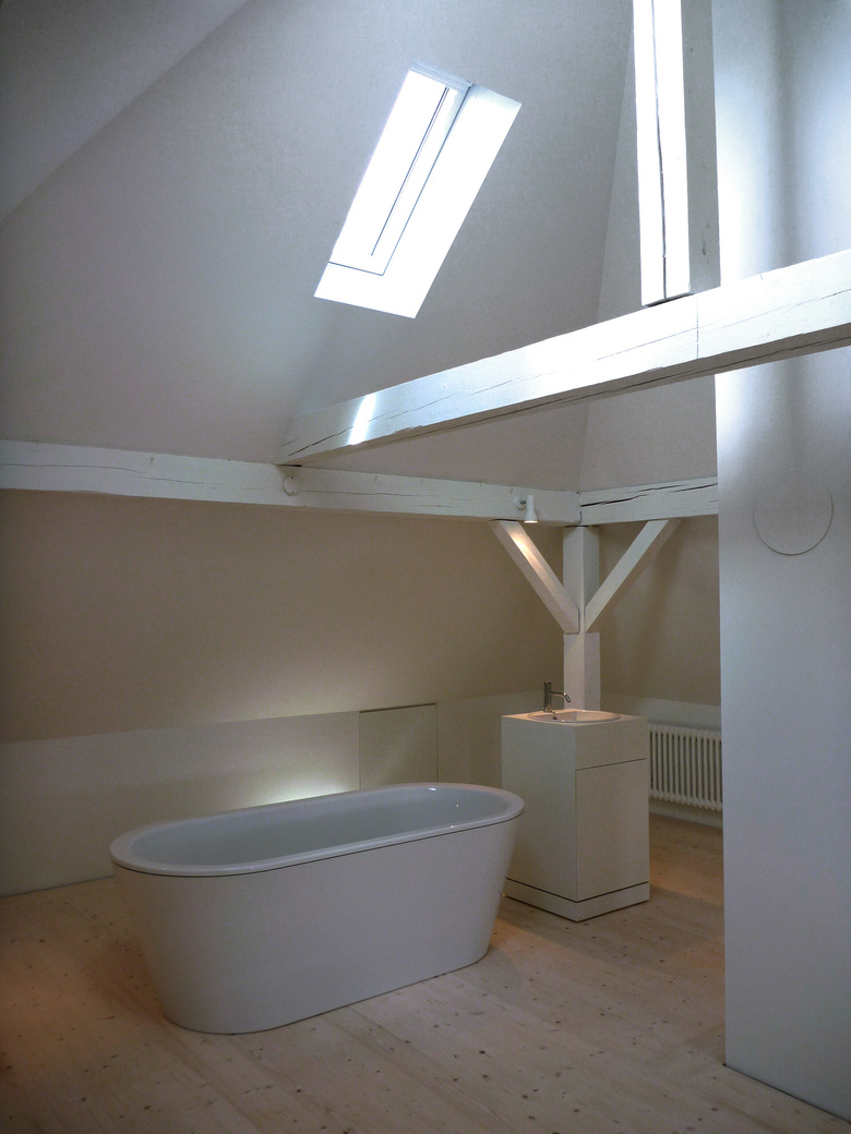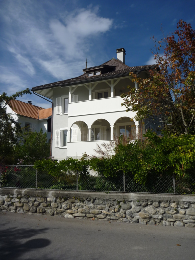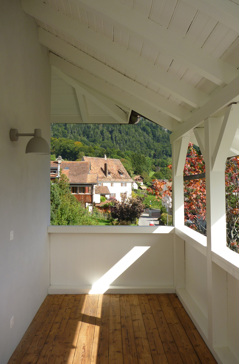 Der schlösschenhafte Charakter mit dem Turmdach über dem Treppenhaus, der angebauten Veranda aus Holz und dem ausladenden Vordach wurde beibehalten und durch die weisse Farbgebung verfeinert. Die einzelnen Elemente verschmelzen zu einem komplexen Gesamtvolumen.
