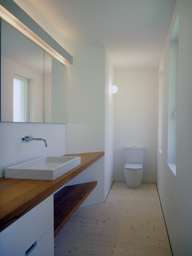 Die kleinteilige Raumaufteilung blieb unverändert, einzig im neuen Wohn-Esszimmer wurde eine nichtragende Trennwand entfernt. Hier galt es die Räume mittels einer einheitlichen Gestaltung und Materialisierung grösser wirken zulassen und zusammenhängend erlebbar zu machen. Akzente wurden mit den Abdeckungen aus geöltem Kirschbaumholz bei den Einbauten in Küche, Bad und Ankleide gesetzt.