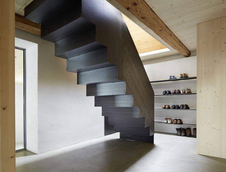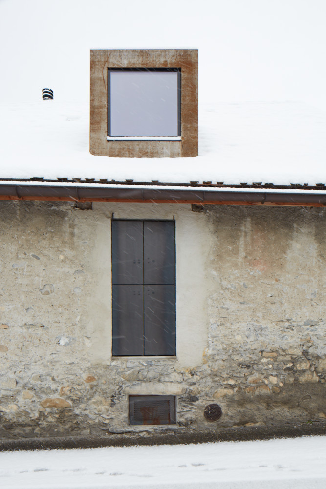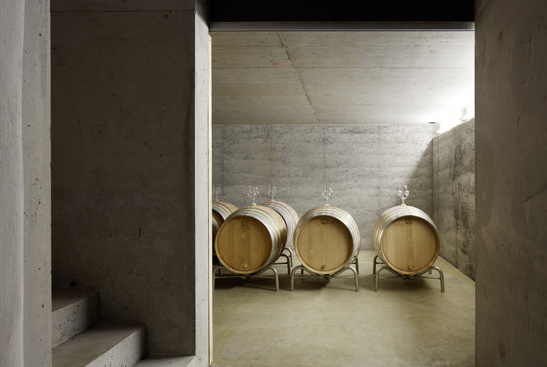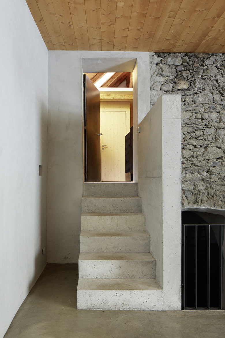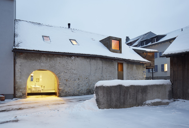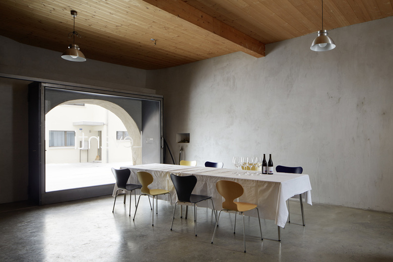 Nebst der Nutzung als Torkel sollte das Raumprogramm um eine Wohnung ergänzt werden. Die Substanz der Gebäudehülle wurde dabei möglichst unangetastet belassen. Der Schwerpunkt der Eingriffe folgte dem Konzept der Weinherstellung. Subtil hinzugefügte Elemente aus unbehandeltem Stahl veredeln die rurale, steinerne Bausubstanz des Bestandes. Der Eingang im Torbogen zeigt die neue Doppelnutzung: die zurückversetzte, verglaste Schiebefront zum Torkel liegt neben dem in der Laibung platzierten Eingang zur Wohnung. Der entstandene Aussenraum gegen die Strasse wird zur Loggia. Zwei Dachgauben belichten den Wohnraum im Dachgeschoss. Sie sind aus rohem Stahl gefertigt und nahtlos in das bestehende Biberschwanzziegeldach eingebaut. Über die Jahre haben diese die gewünschte Patina erhalten und verschmelzen mit dem Dach.