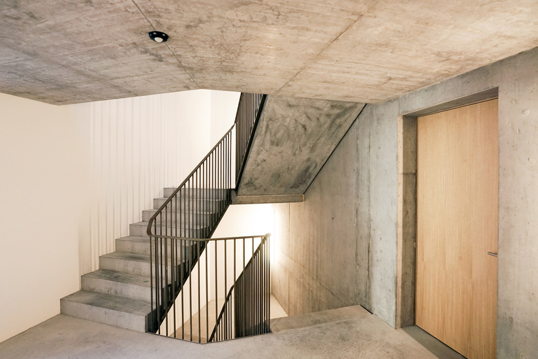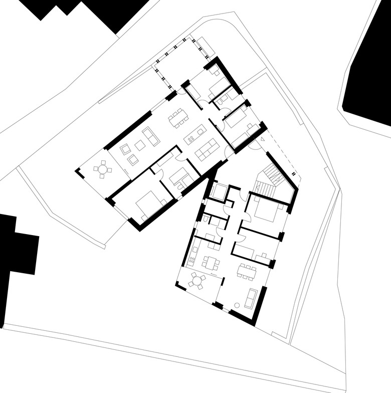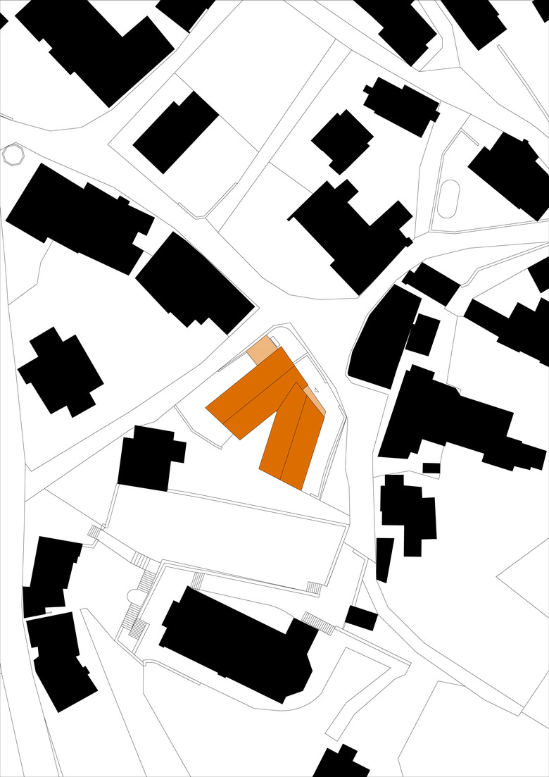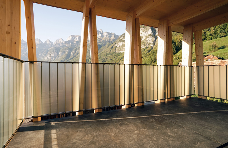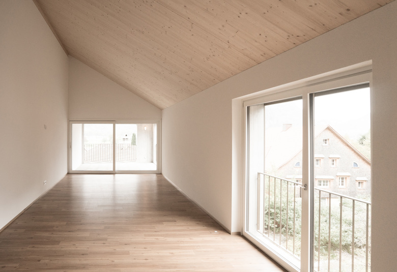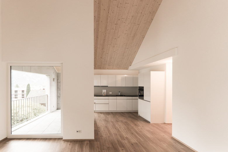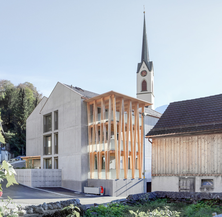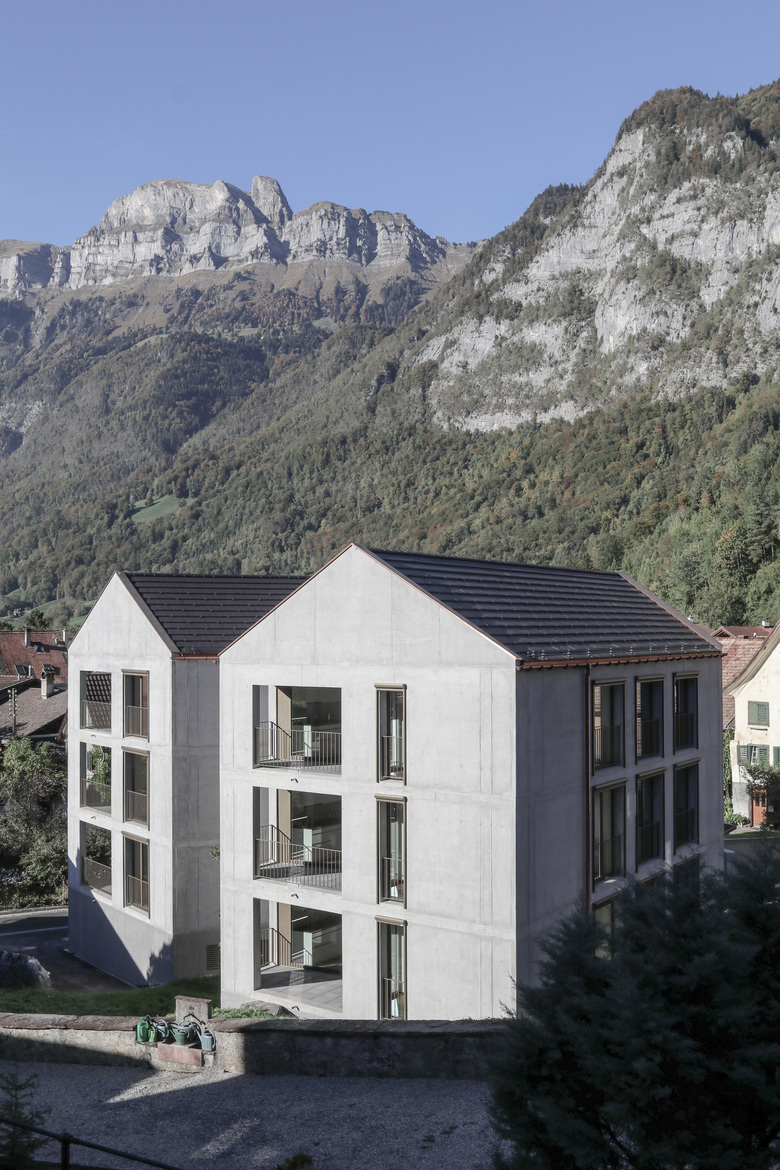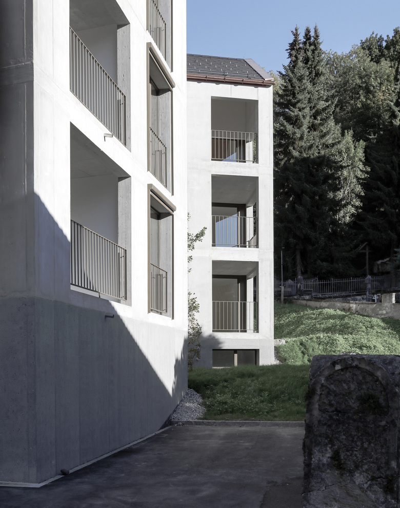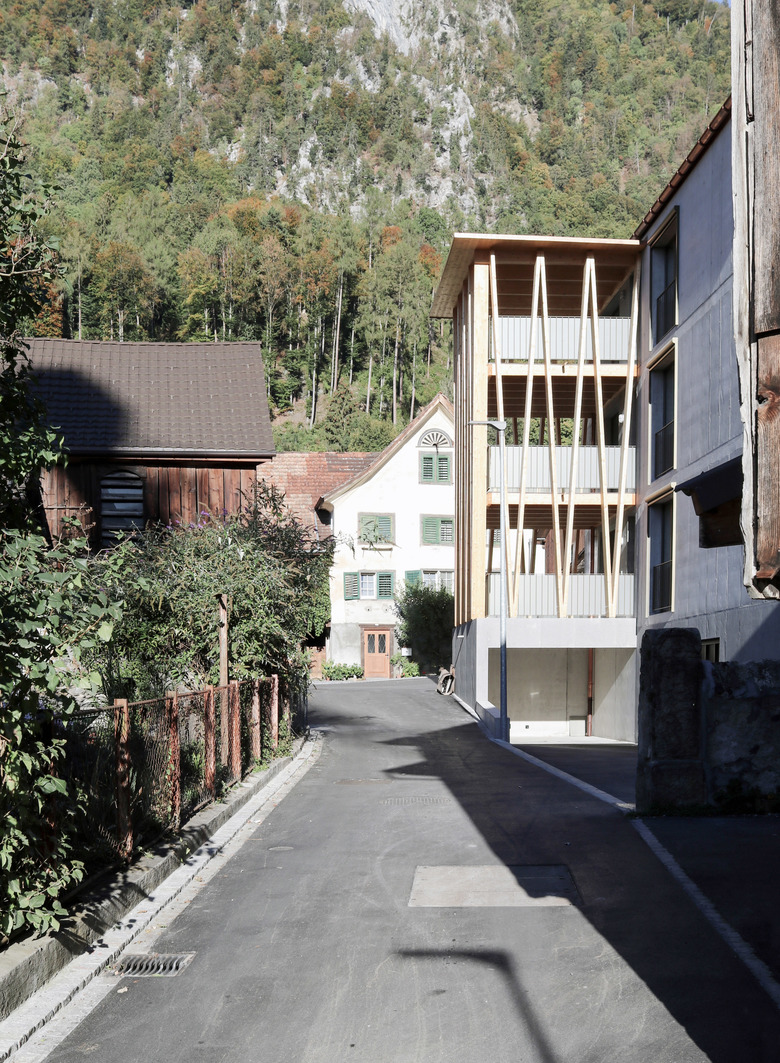 Das alte Restaurant Alvier wurde durch zeitgemässe Wohnbauten ersetzt. Die beiden Neubauten fügen sich durch eine massstabsgerechte Volumensprache in das Ortsbild ein. Sie weisen Steildächer mit 30° Neigung auf und stehen mit ihren Giebelfassaden gegen den Dorfplatz hin. Die bestehende, enge Strassenraumcharakterisitk an der Chlausengasse wird mit dem Laubenanbau räumlich bewahrt. Die beiden Gebäude haben einen gemeinsamen Hauptzugang ab dem Dorfplatz. Die interne Erschliessung ist als Gelenk zwischen die beiden Volumen geschoben. Pro Geschoss sind je zwei Wohneinheiten realisiert.