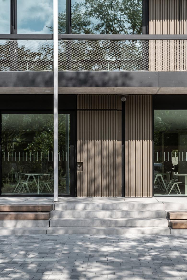 Das Erscheinungsbild des Erweiterungsbaus setzt einen bewussten Kontrast zum Bestandsgebäude: Der massive Baukörper des Bestands wird durch einen transparenten „Pavillon“ ergänzt. Die umlaufenden Fluchtbalkone bewirken eine horizontale Gliederung des Erweiterungsbaus und bieten zudem klimatische Vorteile (Sonnenschutz, Witterungsschutz).
