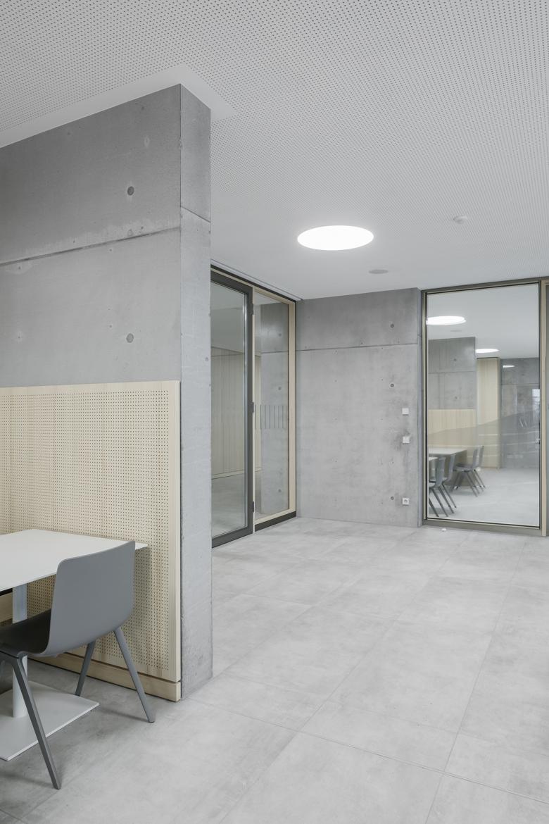 Umlaufende Fluchtbalkone und Außentreppen ermöglichen eine vom Innenraum unabhängige Entfluchtung des Erweiterungsbaus. Dies reduziert die brandschutztechnischen Anforderungen im Inneren und ermöglicht die Nutzung der Erschließungsbereiche für freies Lernen und als Aufenthaltsbereich.
