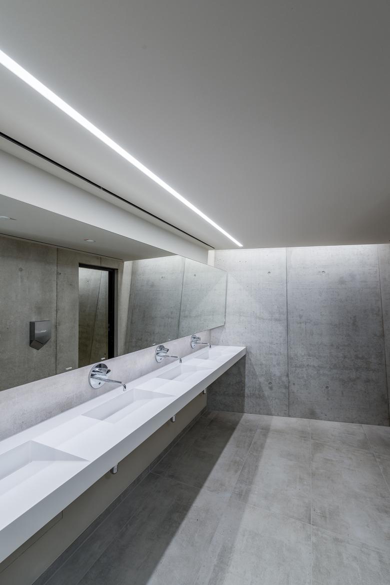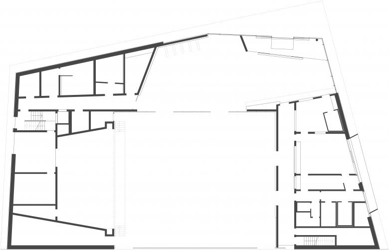Der Hauptzugang zum Gebäude erfolgt über den Vorplatz im Nordwesten des Gebäudes an der Badstraße. Eine Auskragung des Daches mit darunter stehender zurückspringender Fassade schafft einen geschützten Eingangsbereich, der sich im Inneren im Foyer fortsetzt.