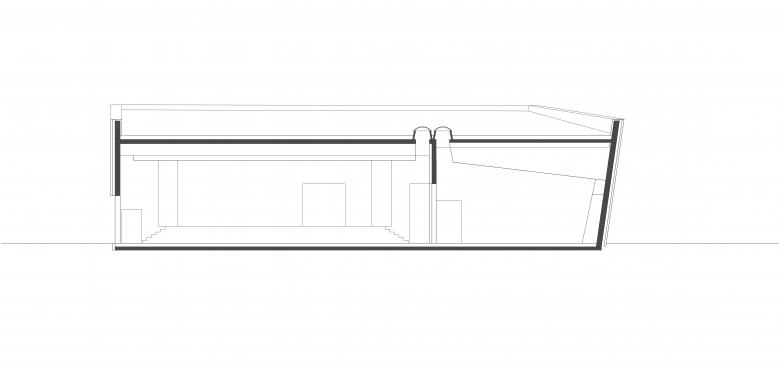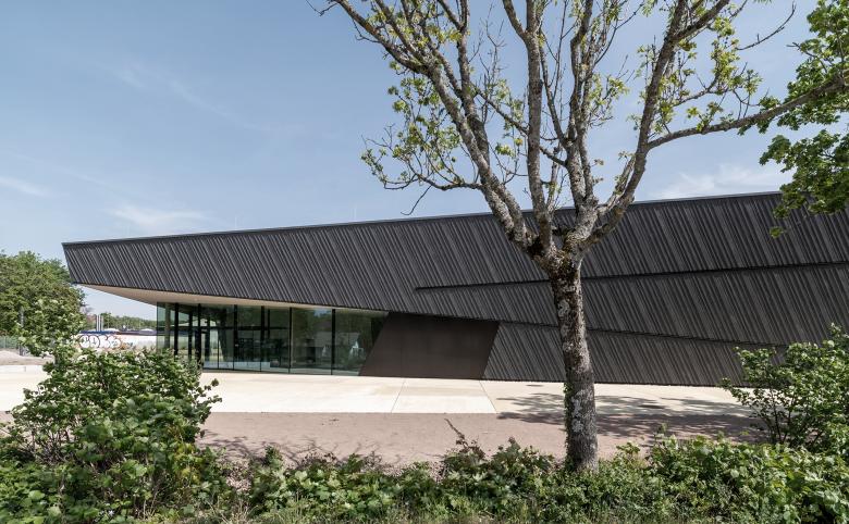 Die Veranstaltungshalle setzt sich als frei ausgeformter Solitär zwischen Cuppamare und Parkierung und verknüpft damit die unterschiedlichen Richtungen der Umgebung.