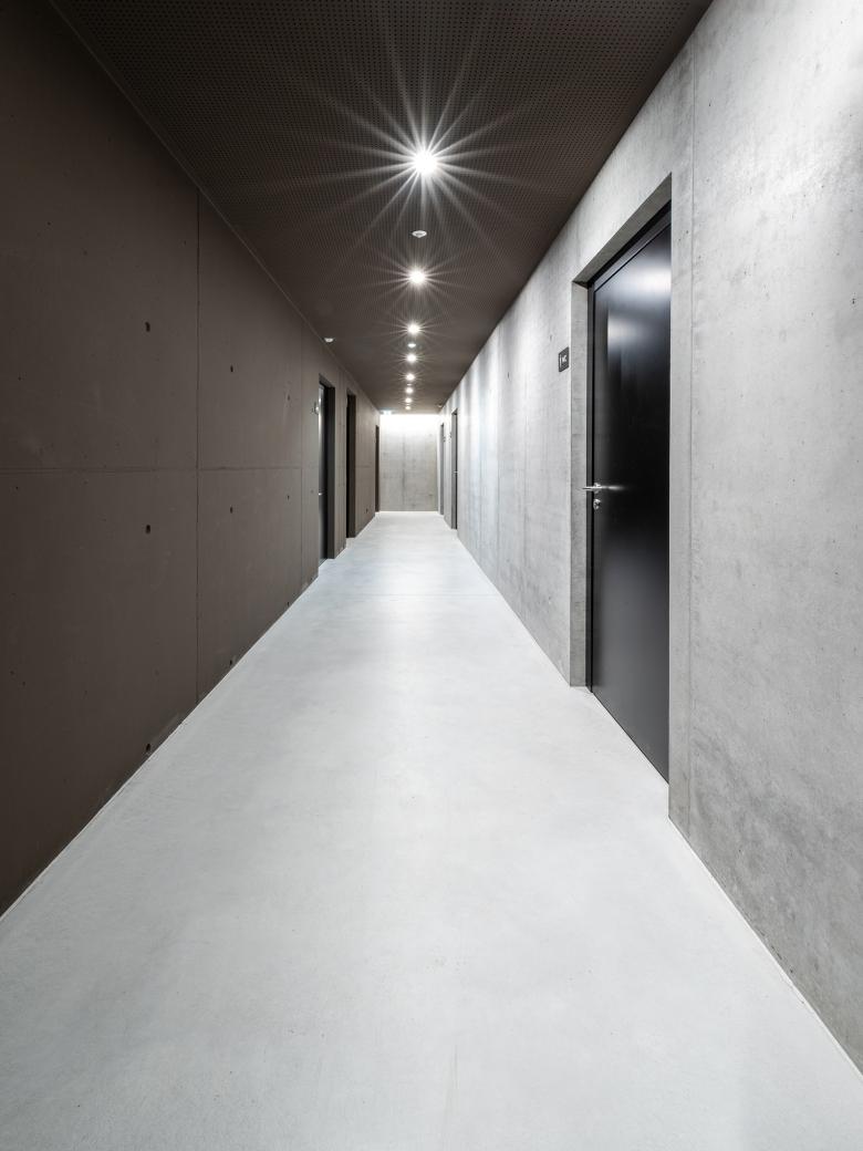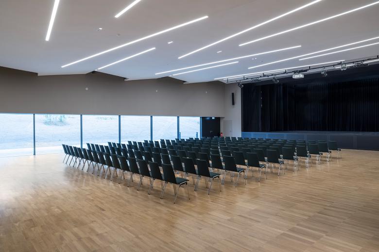 Innen ist die Veranstaltungshalle mit hochwertigen Sichtbeton und warmen Erdtönen ausgestattet. Das unterstreicht die zeitlose Ästhetik. Die reine Veranstaltungshalle erhält als Kernstück einen für 450 Personen ausgelegten Saal, der mit dem Foyer zusammenschaltbar ist und eine Bühne mit Umkleide-, und Nebenräumen beinhaltet. Eine voll ausgestattete Küche ermöglicht eine Essensausgabe zum Saal mit Terrasse und Foyer sowie zur Festwiese im Außenbereich zwischen Vorplatz und Liegewiese des Freibades.