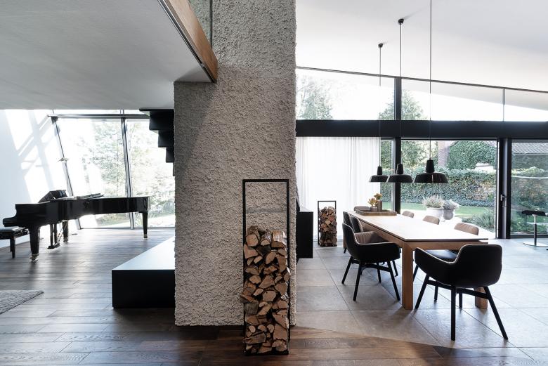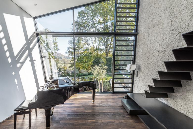 Als Konstruktion wurde eine Hybridbauweise gewählt: Leichte Holzbauteile wurden auf das vorhandene Untergeschoss aufgesetzt, aussteifende Bauteile in Massivbauweise hergestellt. Mit großzügigen Modellierungen der Freianlagen wurde das Haus in die Umgebung eingebunden und im Inneren ein starker Bezug zur Landschaft geschaffen.