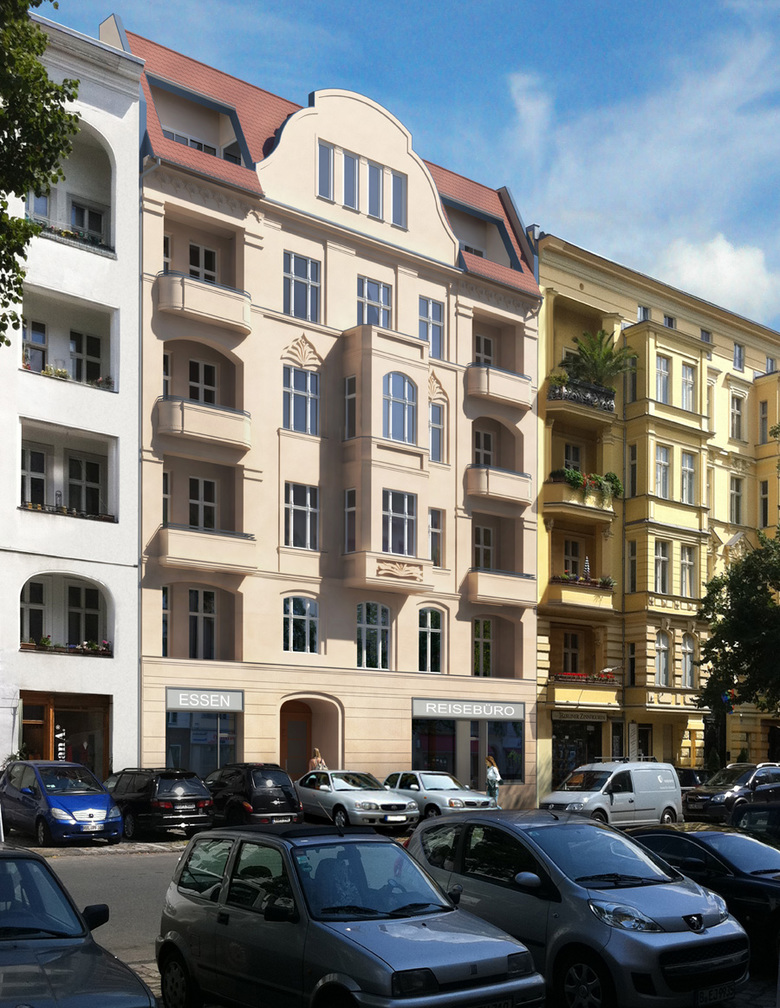 Der vollvermietete Altbau in bester Charlottenburger Lage wurde gemäß heutigen Ansprüchen an Nachhaltigkeit und Komfort modernisiert. Zwei Fahrstühle, eine neue zentrale Fernwärmeheizung, die Dämmung der Hoffassaden und die wieder hergestellte Stuckfassade lassen das Haus in seinem alten Glanz erstrahlen. Im neuerrichteten Dachgeschoß entstehen eine große Gewerbeeinheit und eine Wohnung mit großen Dachterrassen.
