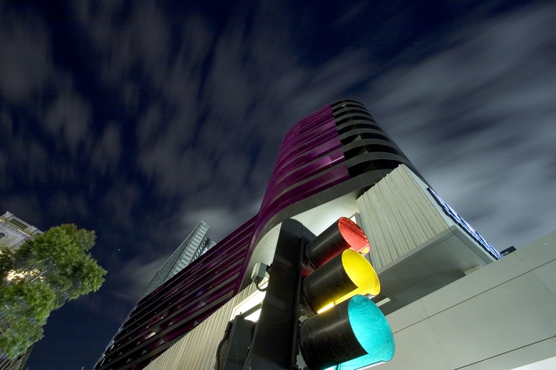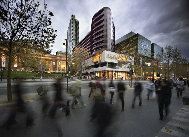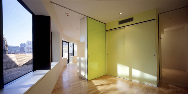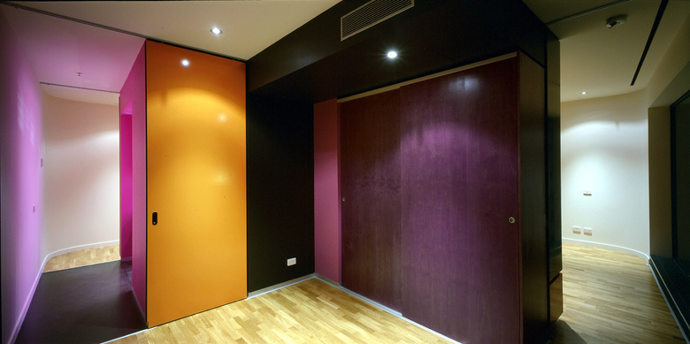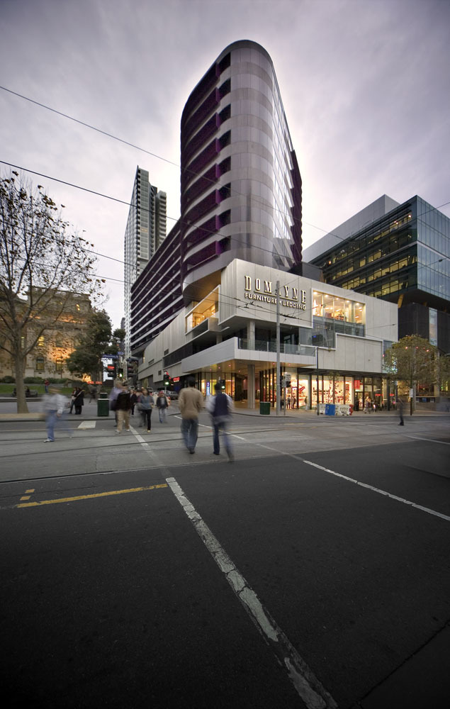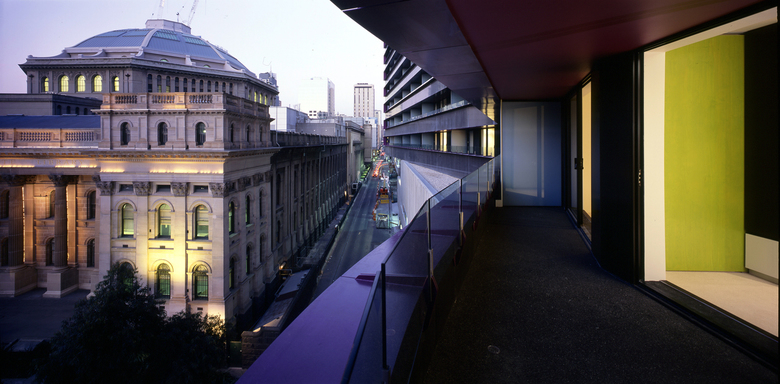 Our project was for an eight level apartment building comprising of 136 apartments above a 3-storey retail podium by another firm. The elation of our first large commission was tempered by a terrifying sense of responsibility - the design of a speculative apartment building opposite the historic State Library, its forecourt and Melbourne's ceremonial axis. At this scale our architectural anxieties were amplified. We faced a shifting program (or market), a limited material palette and the repetitive language of the typology which resisted our preference for a single gesture. The design also had to survive the rigours and inevitable cost-cutting of speculative construction. The breakthrough came when we divorced the apartments from their retail podium by a transfer slab. The new building was a simple object but one capable of responding to a multitude of urban conditions. We heightened the tensions between podium and tower, historical city datum and contemporary skyline. We inflected the form by the presence of the State Library's dome. We accepted stacking and repetition, seeking its intrinsic value and resonance. Focusing on materials which were appropriate to the site, that had longevity and which would enhance the form we alternated bands of polished black concrete and pearlised painted metal fins / black aluminium. Within the singularity of the form we had a parallel ambition to design every apartment differently. In each apartment a similar model is followed, a central service core contains the kitchen, bathroom, mechanical services and joinery. Sliding doors retract into the core to allow for continuous circulation and flexibility. Surprisingly we found that the more convoluted the apartment perimeter the better the apartment. The shape which was originally about public responsibility was now increasing the private amenity. The building's distorted envelope resulted in seventeen unique apartments, multiplied by four colour schemes. We had approached our ambition.