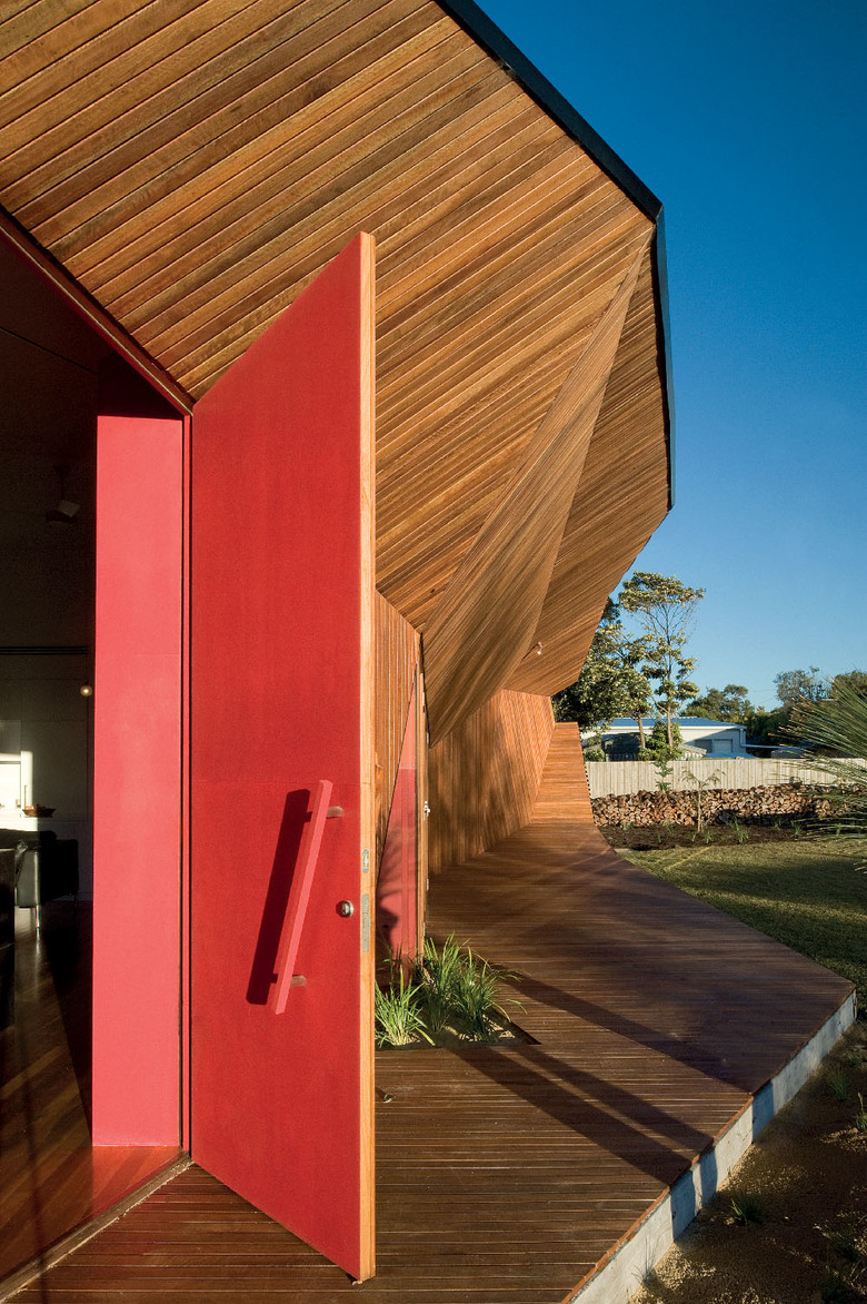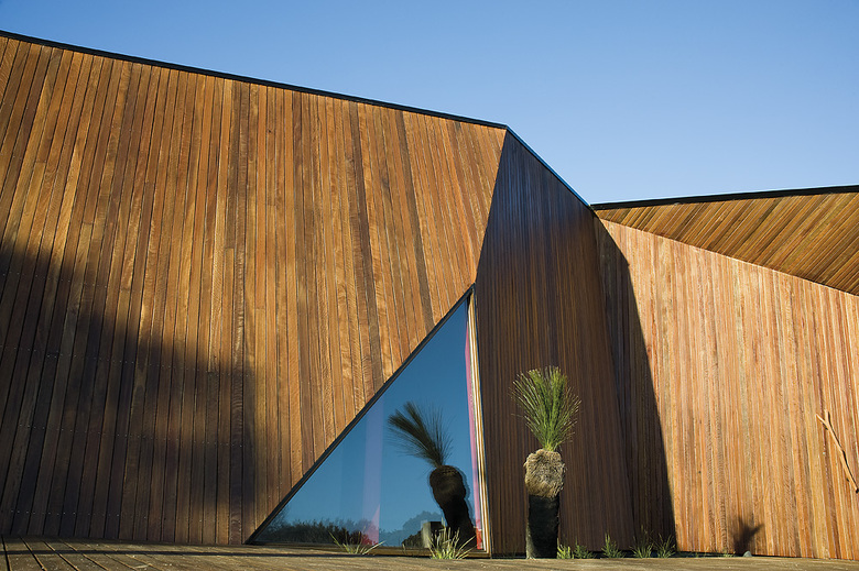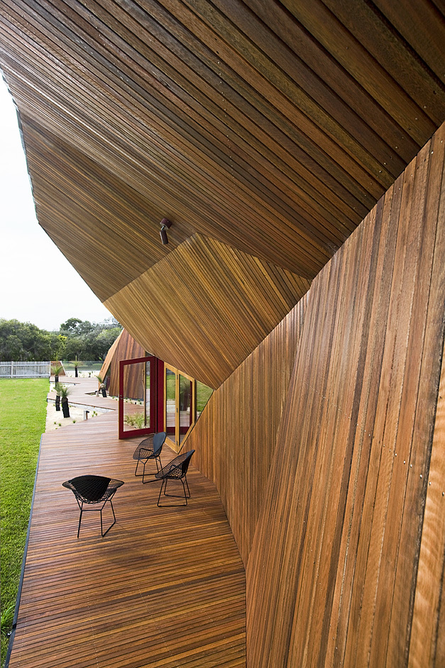 There is a clear hierarchy in this house. Contrasting to the raked timber wall that stretches from the letterbox to become the westerly verandah, the remainder of the house appears as a simple modernist expression akin to many of the houses of the region. On approach, the raked timber wall appears to have morphed from out of the diminutive letterbox. Yet from other perspectives the house appears to have been carved away. The two techniques are conceptually contradictory.