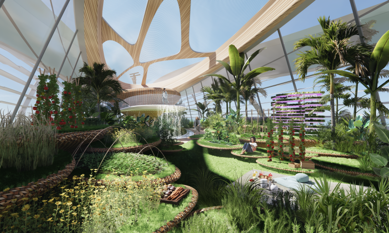 Neben den technologischen Innovationen und der ambitionierten äußeren Gestalt, setzt auch das Innere der Yacht neue Masstäbe. Das Innenraumkonzept bricht mit vielen traditionellen Standards im Yachtdesign und entspricht der visionären, naturnahen Philosophie des Projektes: ein lichtdurchfluteter, Loft-artiger Raum bildet ein großzügiges Raumkontinuum aus Greenhouse, Wohnzimmer-Lounge, Küche, Bar und Gemüsegarten. Luxus wird komplett neu geschrieben: naturnahe Umgebung anstatt Plexiglas und Messing. Natürliche gesunde Luft anstatt Klimatisierungsoverkill. Health food aus bordeigenem Anbau, frischer Fisch aus dem Ozean, Entspannen, Workouts, Online Business Meetings, Feiern mit Freunden – alles findet im inspirativen Ambiente des paradiesischen Biotops statt. Der zusätzliche Wasserbedarf für die Pflanzen wird über die Meerwasserentsalzungsanlage zur Verfügung gestellt, die über die Photovoltaikanlage auf dem Dach und der Außenhaut emissionsfrei betrieben wird. Der Masterbedroom ist ein nach oben offener Raum innerhalb des Greenhouses – mit Blick in den nächtlichen Sternenhimmel. Das offene Raumkonzept entspricht modernen Wohnkonzepten einer neuen Generation von Yachten: offen, unkonventionell und naturnah.