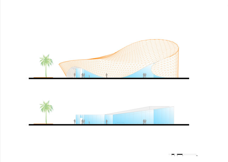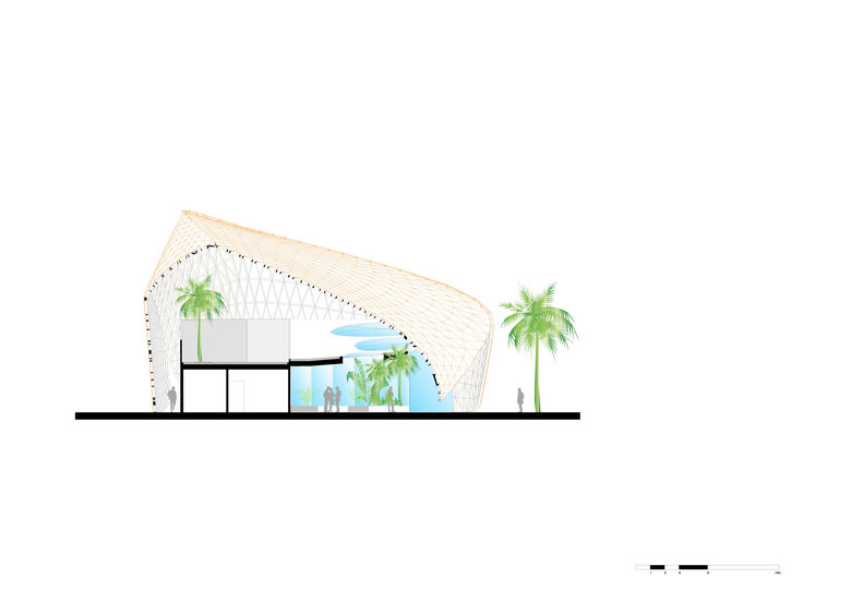 Das aus drei ineinandergreifenden Flächen geformte Dach spannt einen 800 Quadratmeter großen Freiraum auf. Besucher stehen in einem organischen Körper, getragen von baumartigen Stahlstützen und neun Auflagerpunkten am Rand. Er erinnert an einen Kokon, wie ihn Schmetterlinge zur Verpuppung ausbilden. Gefestigt wird das stählerne Tragwerk durch einen umlaufenden, dreidimensional ausgebildeten Randträger, der die Spannung des Dachs aufnimmt, und durch ein Netz aus Knoten und Dreiecksverbindungen. Die Herausforderung der nach der Finite-Elemente-Methode (FEM) berechneten Stahlelemente bestand darin, die theoretisch erforderlichen 4000 individuellen Knoten so zu systematisieren, dass schließlich 600 ausreichten, um den richtigen Grad zwischen Varianz und Effektivität zu erzielen. An jedem Knoten laufen die tragende Stahlstruktur und die nur drei Millimeter dünnen Aluminiumblätter zusammen und nehmen in mehreren Ebenen eine Vielzahl unterschiedlicher Verbindungswinkel auf. So entstand ein flirrendes Blätterdach, unter dem Anschlüsse und Verschraubungen unsichtbar verlaufen.