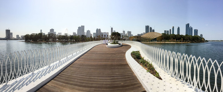 Licht ist ein zentrales Thema in der arabischen Kultur, und so legte man besonders Augenmerk darauf, die Goldtöne und Glanzgrade der Materialien zu einem farblich homogenen Ganzen abzustimmen. Die Herausforderung bestand darin, dass die unterschiedlich beschichteten und farblich gefassten Bauteile Sonne und Salzwasser trotzen und somit maritimen Anforderungen genügen mussten. Stahlträger wurden in einem Sonderfarbton lackiert, Knoten pulverbeschichtet und Blüten eloxiert.