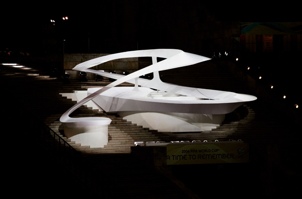 Die auf halber Höhe der Publikumsränge positionierte Bühne kontrastierte durch ihre dynamisch geschwungene Formgebung wirkungsvoll mit der monolithischen Architektur des Marathontores. Das Siegerpodium nahm die fließende Linienführung der Bühne auf und hob sich dadurch deutlich von den bislang eher konventionell gestalteten Podestanlagen ab. Der Pokalsockel, auf dem die begehrte Trophäe während des Finales gut sichtbar am Spielfeldrand positioniert war, war ebenfalls Bestandteil des integrativen Designkonzepts von 3deluxe.
