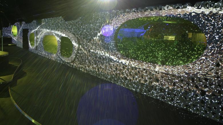Ein raumfüllendes Raster aus silberfarbenen, von der Decke abgehängten Glasfaserschläuchen betont die Geometrie des Entwurfs noch zusätzlich. Um die lineare Strenge zu brechen, wird diese so genannte Fadenmatrix mit einer komplexen medialen Ornamentik überlagert. Die Beamerprojektionen bewegen sich im Einklang mit der Musik und illustrieren auf diese Weise die variierenden dreidimensionalen Klangräume, die der DJ zeitgleich erzeugt.
