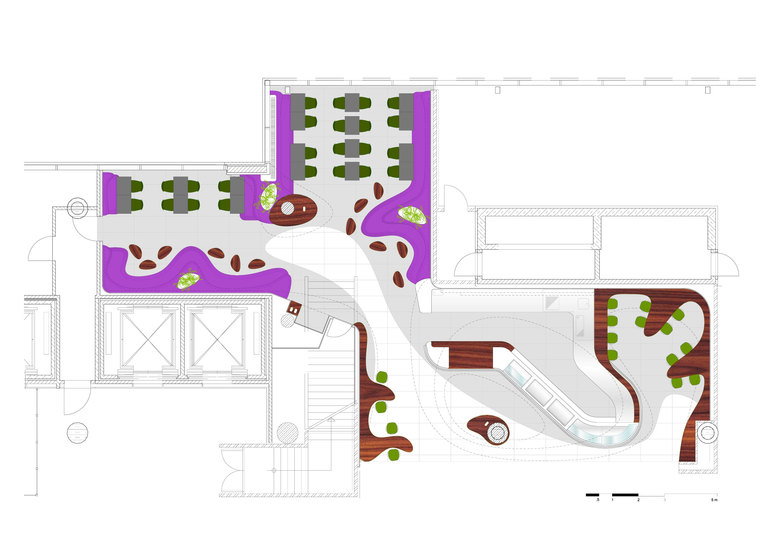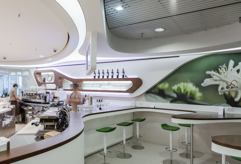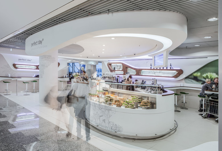 Die innenarchitektonische Gestaltung des perfect day schafft eine einladende, von Licht erfüllte Atmosphäre. Ihre ansprechende Wirkung beruht auf dem ausgewogenen Zusammenspiel organischer Formen mit kontrastreich eingesetzten Farben und Materialien sowie stimmungsvollen Beleuchtungsszenarien, die tageszeitlich variieren. Entlang der geschwungenen Konturen des maßgefertigten Mobiliars entwickelt sich ein fließendes Raumkontinuum, das aus dem vorderen Verkaufs- und Ausschankbereich in die dahinter liegende Lounge mit Airside-Panorama leitet. Das perfect day bietet seinen Gästen eine anregende und zugleich erholsame Umgebung, in welcher der Mensch und sein Wohlbefinden im Mittelpunkt stehen.