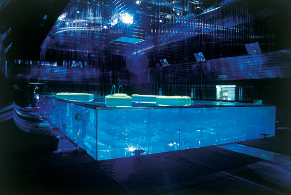 Thematische Inszenierung – In Anlehnung an eine traditionelle Schweizer Badeanstalt wurde der 'Cyberhelvetia'-Pavillon auf der Expo.02 als Ort der persönlichen Begegnung und Kommunikation konzipiert. Kommunikation kann heutzutage auf vielfältige Art und Weise stattfinden, unabhängig von Ort und Sprache. Auch ein gemeinsames Bad benötigt kein reales Wasser mehr: Ein blau leuchtender Glasquader ersetzte das reale Schwimmbecken – die Ausstellungsbesucher tauchten kopfüber in die vielschichtige Atmosphäre einer virtuell erweiterten Wirklichkeit und badeten in Licht und Klang.