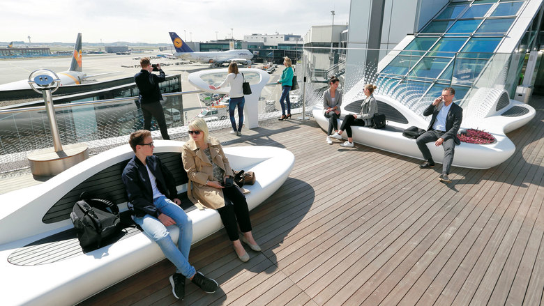 Am Frankfurter Flughafen wartet es sich in erholsamem Ambiente – und jetzt auch unter freiem Himmel. Im Transitbereich von Terminal 1 können Fluggäste die Zeit nach dem Check-In oder bis zum Anschlussflug auf einer von 3deluxe gestalteten, komfortablen Dachterrasse verbringen.